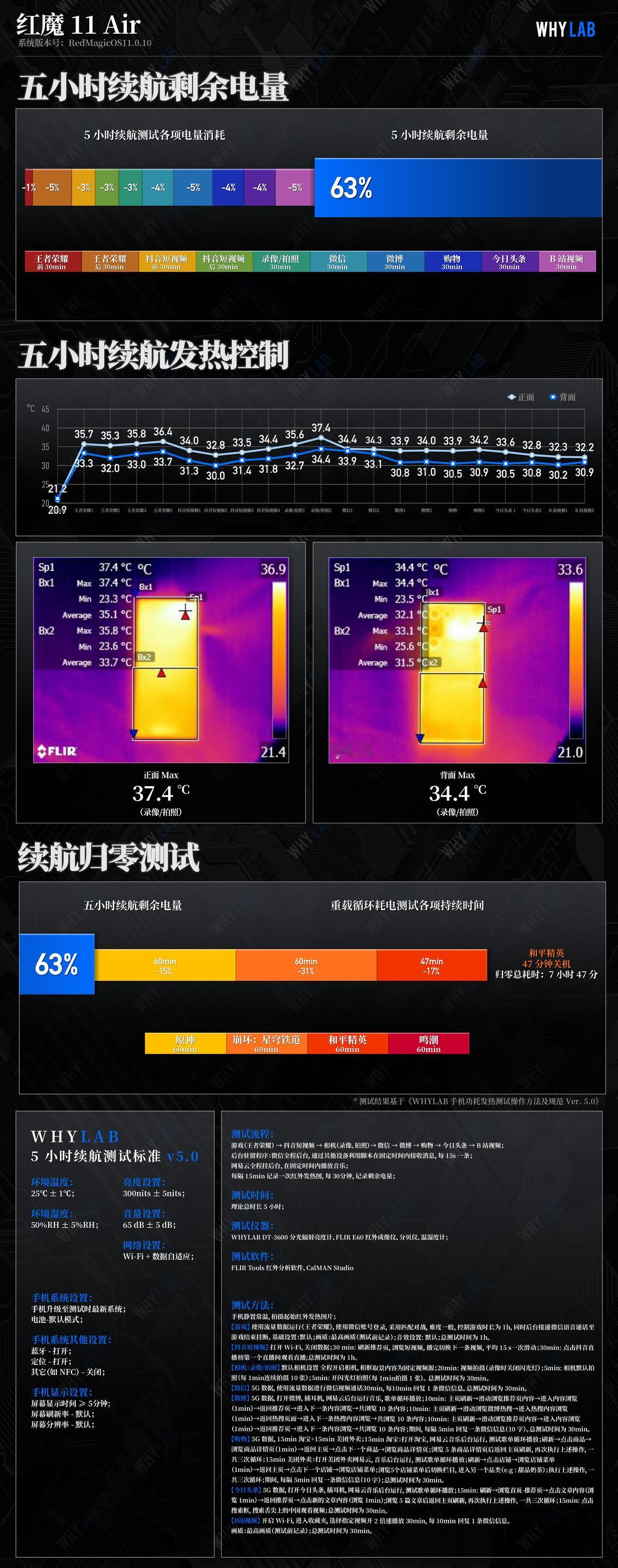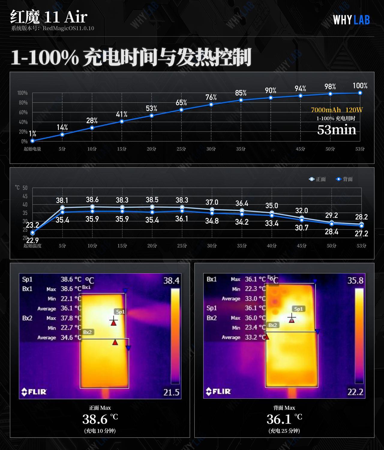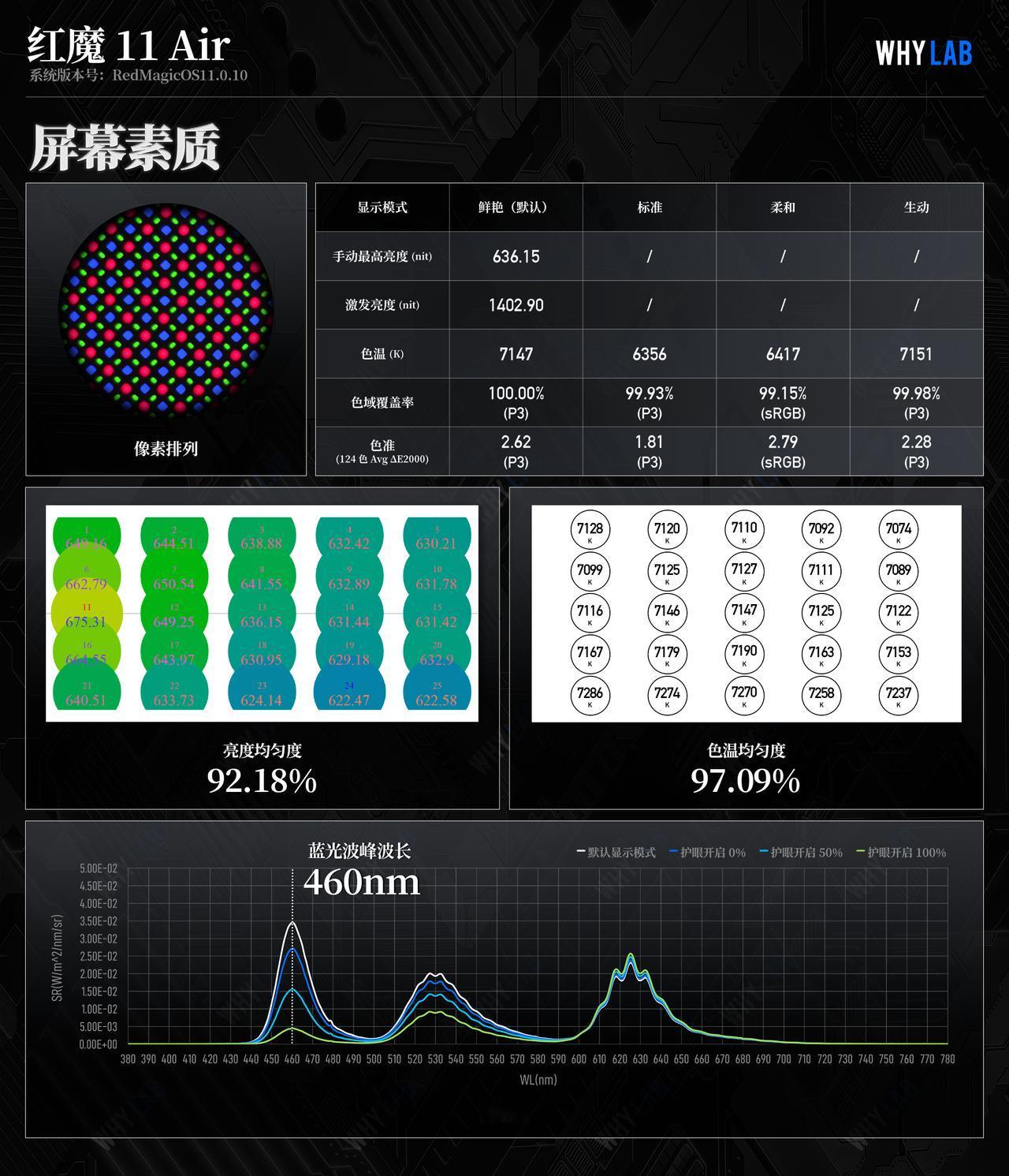 新增红魔 11 Air 测试数据,红魔 11 Air 的相机数据以及更多新机的测试数据可以访问小程序「WHYLAB」,进行查看。 ➢ 🎮 游戏:作为全球首款内置风扇的 Air 机型,红魔 11 Air 的硬件选型自然也不虚,上一代旗舰芯片骁龙 8 至尊版 + 9600Mbps LPDDR5X 内存 + UFS 4.1 闪存,当友商类似配置都在 2500 价位徘徊时,红魔何以定价 2999 元? 首先就是性能上的调校,非常出色,说是性能表现最出色的骁龙 8 Elite 也不为过。轻负载的《王者荣耀》中,得益于升级了一块 144Hz 屏幕,红魔 Air 系列也成功解锁了王者 144fps 模式,15 分钟一局对战,帧率全程是一条直线,平均帧率 145.08fps,功耗发热极低,仅有 3362.17mW 和背面 36.4℃; 《原神》纳塔 869P 30 分钟,帧率依旧拉满,平均 60.96fps,平均功耗 4335.48mW,背面也只是微微发热的 41.6℃; 高负载的《绝区零》842P 30 分钟,不删除转场掉帧,平均帧率 60.33fps,严重抖动 19 次,平均功耗 4.5W,背面最高 41.3℃,表现好的不像骁龙 8 至尊版,游戏调校确实有种红色魔力; 继续上压力,测试《崩坏·星穹铁道》黄金的时刻 2160×977 渲染分辨率,平均帧率也做到了满帧,平均 60.48fps,功耗控制优秀 6627.01mW,背面温度最高处在出风口附近,为 48.6℃。 小小总结下,如果你想买台轻薄的游戏专用机,选红魔 11 Air 准没错,可以应付绝大多数高负载场景,甚至有和骁龙 8 Elite Gen 5 机型一战之力; ➢ 📱 屏幕:采用了一块 6.85 英寸 2688×1216 的京东方 Q10 OLED 真全面屏,看选型,应该是和努比亚 Z70 Ultra 是同一块屏幕,实测手动最高亮度达到 636.15nit,全局激发亮度 1402.9nit,亮度均匀度差点意思,只有 92.18%,手机右上角偏暗。默认鲜艳模式下,屏幕的色温为 7147K,偏冷;在色准方面,鲜艳模式下 P3 124 色平均 DeltaE 为 2.62、如果追求显色精准,建议选择标准模式,P3 124 色平均 DeltaE 为 1.81,希望能在迭代机型里看到红魔能调优; ➢ 🔋 续航:相比上代电池增加 1000mAh,配备一块 7000mAh 牛魔王电池,在模拟一般用户日常一天使用的五小时续航中,剩余 63% 电量,成绩和 iQOO 15、荣耀 Magic8 Pro 相当;继续用剩余电量循环大型游戏到关机,续航归零成绩为 7 小时 47 分,介于努比亚 Z80 Ultra 和 iQOO 15 之间,与常规形态直板机有差距,但确实续航表现最好的 Air 机型之一了; ➢ ⚡️ 充电:搭配 120W 快充,从 1% 开始,10 分钟即可充电 28%,完全充满用时 53 分钟,充电期间,背面最高温度 36.1℃,我们认为红魔充电时温度策略太过保守,可以稍微放开一些温控,缩短充电时间。 以上就是红魔 11 Air 的实验室测试数据,2999 元的价格随比友商同配置机型定价稍贵,但提供的游戏和性能体验是领先的,如果对游戏和手机的便携有比较极致的追求,那么红魔 11 Air 会是不错的选择。