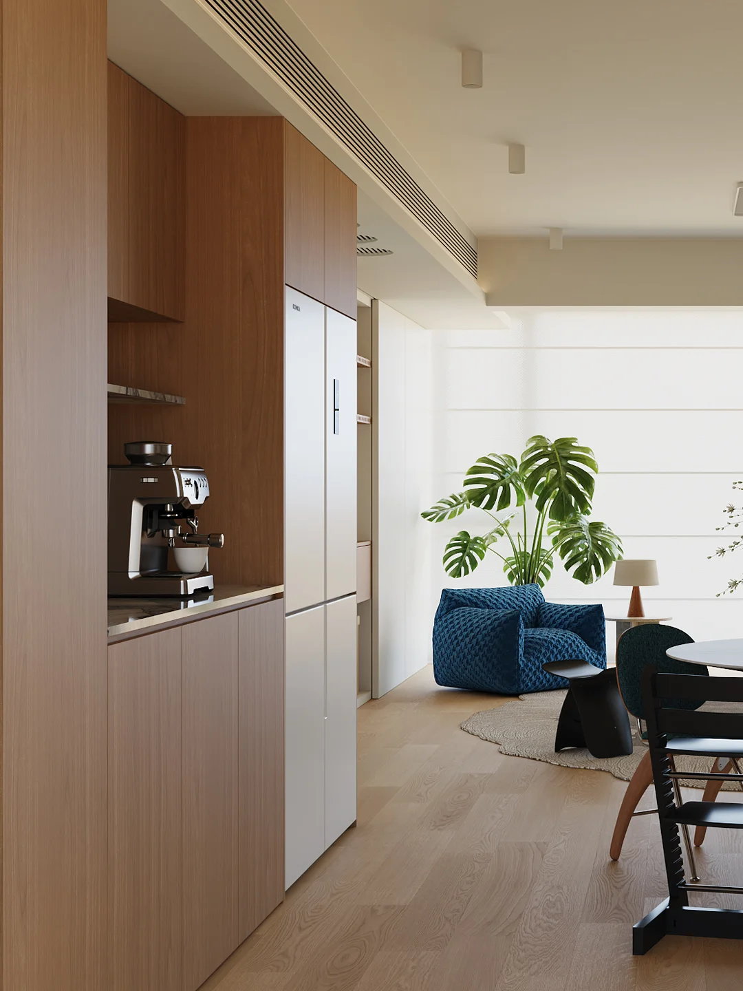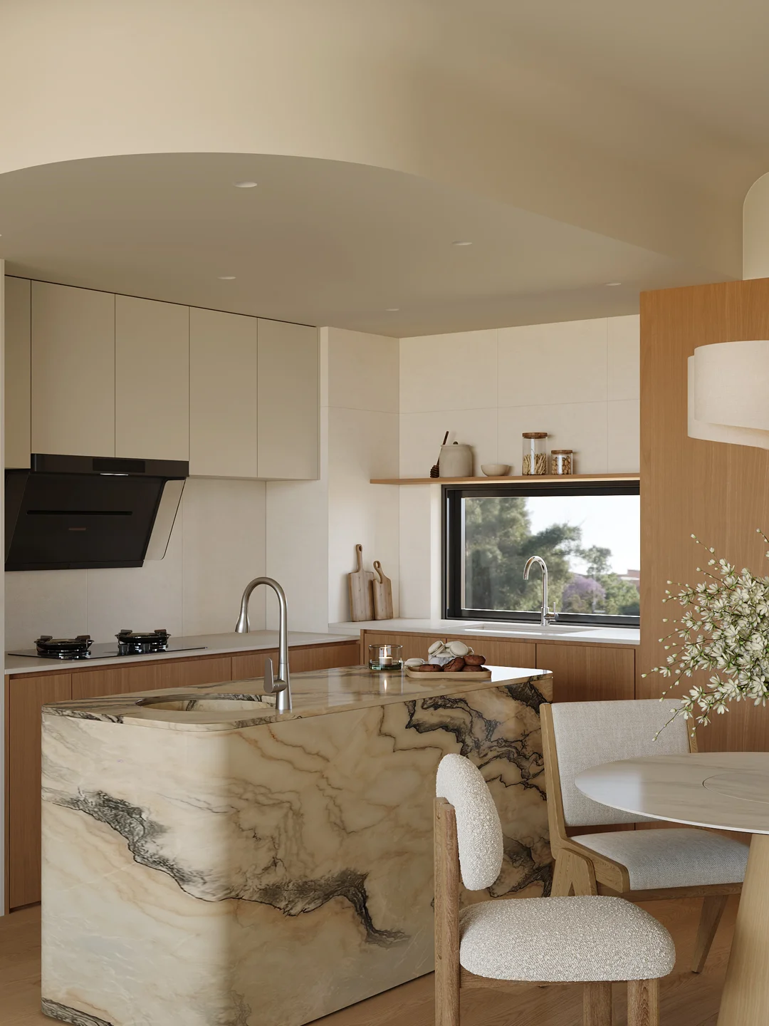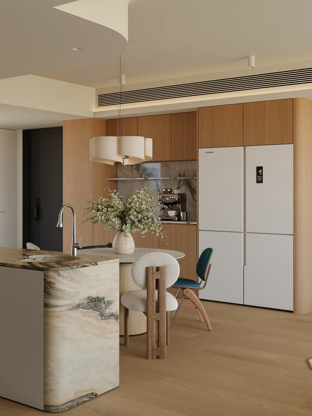 拆除了一个房间,和客厅打通,让家里多出一个好看又好玩的儿童空间 开放式厨房,餐厨一体,解锁了更多的生活方式 大理石岛台是餐厅的C位,颜值在线,也能兼并家里多种功能需求