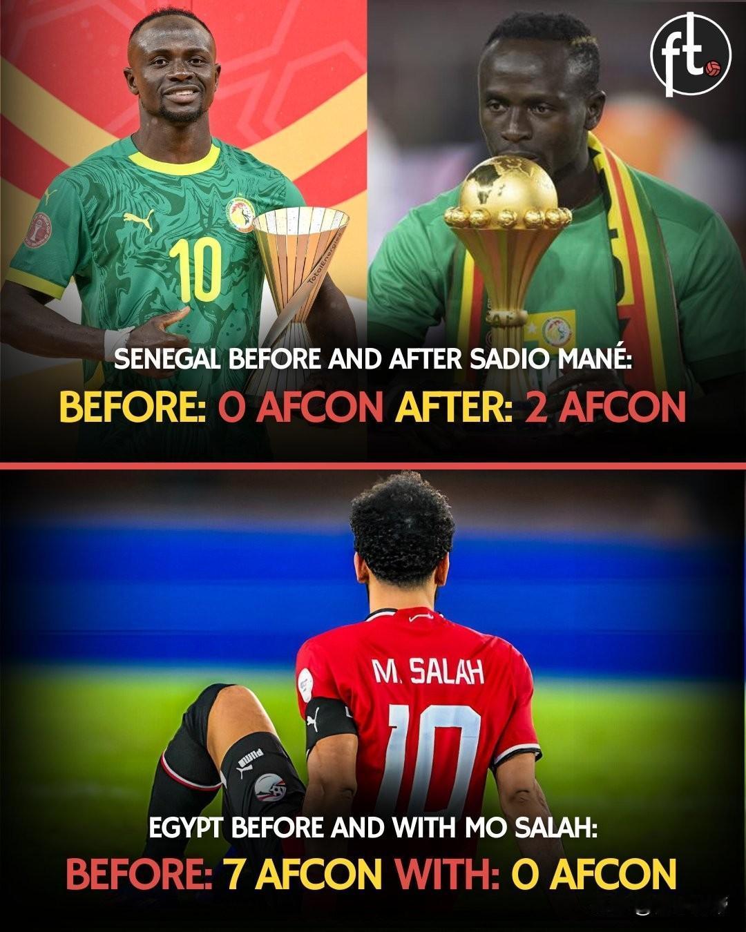 萨拉赫尴尬了,马内才是真正的非洲之王! 萨拉赫加入埃及国家队之前,埃及拿到了7座非洲杯冠军是公认的非洲足球之王,但是萨拉赫加入埃及国家队之后,埃及却连一座非洲杯冠军都没有拿到。 作为对比,马内加盟塞内加尔之前,塞内加尔还没有拿过非洲杯冠军,而马内加入塞内加尔国家队之后,带领塞内加尔拿到了2座非洲杯冠军。 由此可见马内才是真正的非洲之王,萨拉赫虽然在利物浦取得了巨大的成功,但是在埃及国家队却相当不给力了,没能重振祖上荣光。