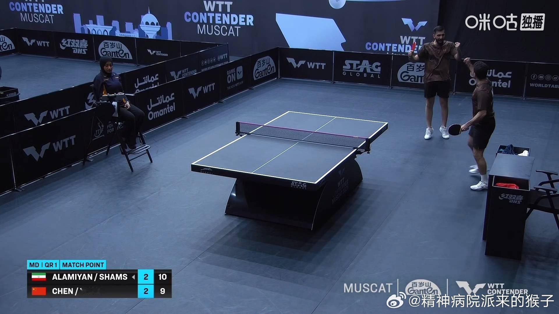 陈垣宇袁励岑2比3阿拉米扬沙姆斯(7,5,-10,-3,9)止步2026WTT马斯喀特常规挑战赛男双资格赛阿拉米扬沙姆斯晋级正赛卡师和陈图发球已吃饱。。。。。第三局10:8被逆转了,决胜局8:5被逆转了