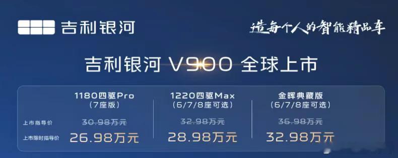 吉利银河V900全球上市26.98万起 吉利银河品牌旗下全新中大型MPV——银河V900正式上市,三款配置,官方指导价区间为30.98-36.98万元,并提供上市限时指导价,区间为26.98-32.98万元。官方还推出多项上市权益,包括全系升级旗舰级纳米陶瓷漆、赠送电动伸缩踏板等,其中金晖典藏版前3000名提车用户可获赠价值1.5万元的10克纯金车标。大V聊车