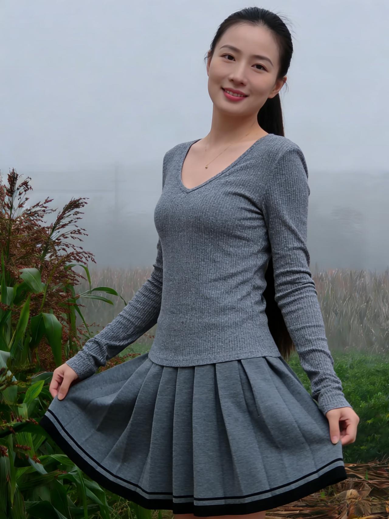 《剧场》 玉米秆是观众 红缨是他们举起的灯牌 你站在田埂上 开始一场即兴的演出 ~ 左手拎起裙摆 是第一幕的开场 右手轻搭裙边 是第二幕的伏笔 笑容是台词 雾是舞台的幕布 马尾的摆动 是背景音乐的节拍 ~ 没有剧本 没有导演 你只是凭着本能 把快乐演得淋漓尽致 当风为你伴奏 雾为你打光 整个郊野 都成了你的专属剧场