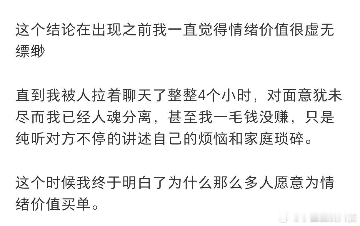 “这个时候我终于明白了为什么那么多人愿意为情绪价值买单。”