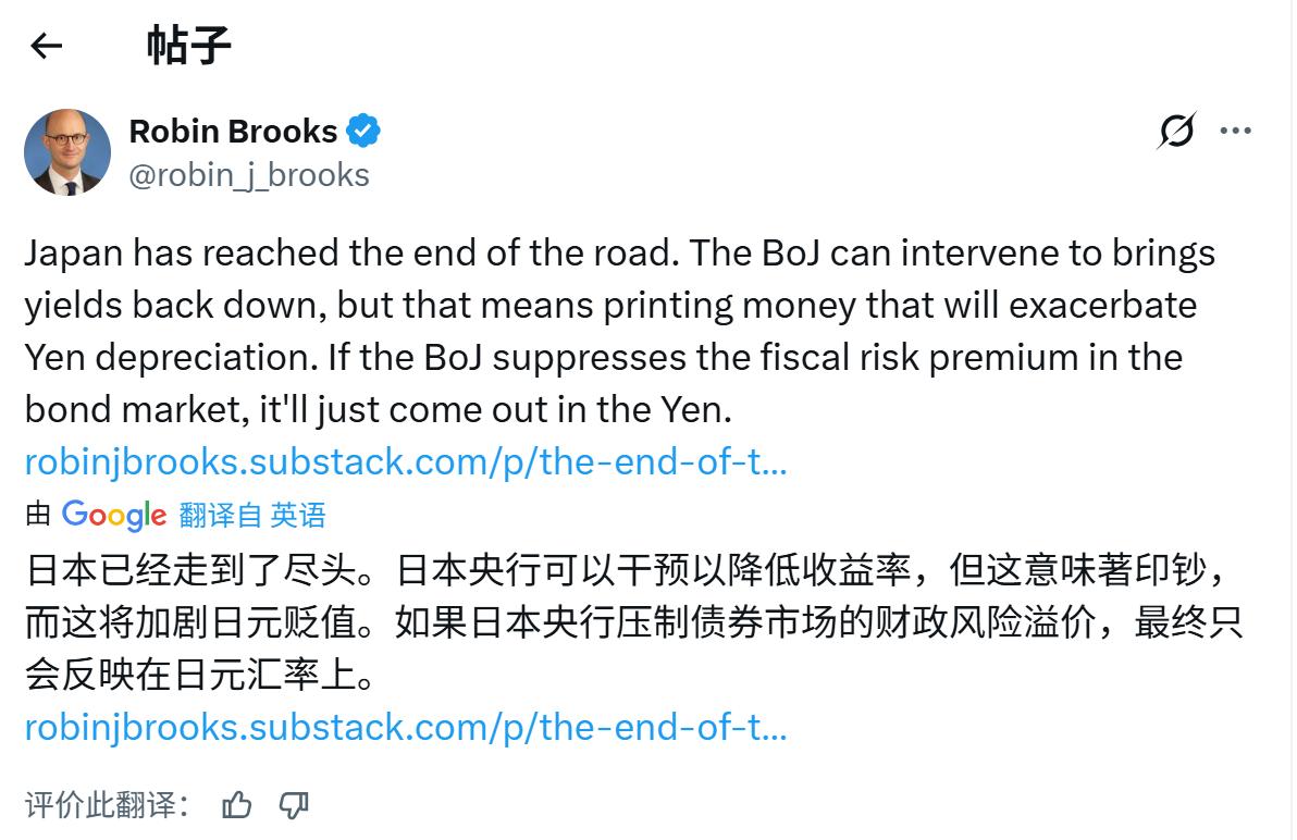 前高盛首席经济学家: 日本已经走到了尽头! 要么日债收益率飙涨!要么日元加剧贬值! 日本央行可以干预以降低收益率, 但这意味著印钞, 而这将加剧日元贬值。 如果日本央行压制债券市场的财政风险溢价, 最终只会反映在日元汇率上。