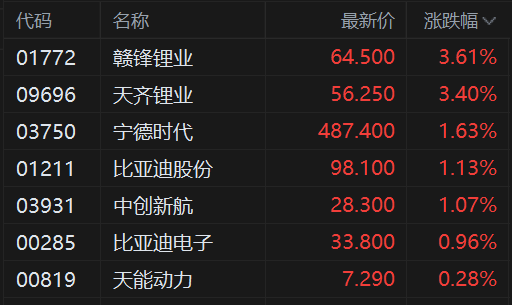 港股锂电池股概念股继续上涨,其中,赣锋锂业涨3.6%,天齐锂业涨3.4%,宁德时代涨1.6%,比亚迪股份、中航创新、比亚迪电子、天能动力跟涨。