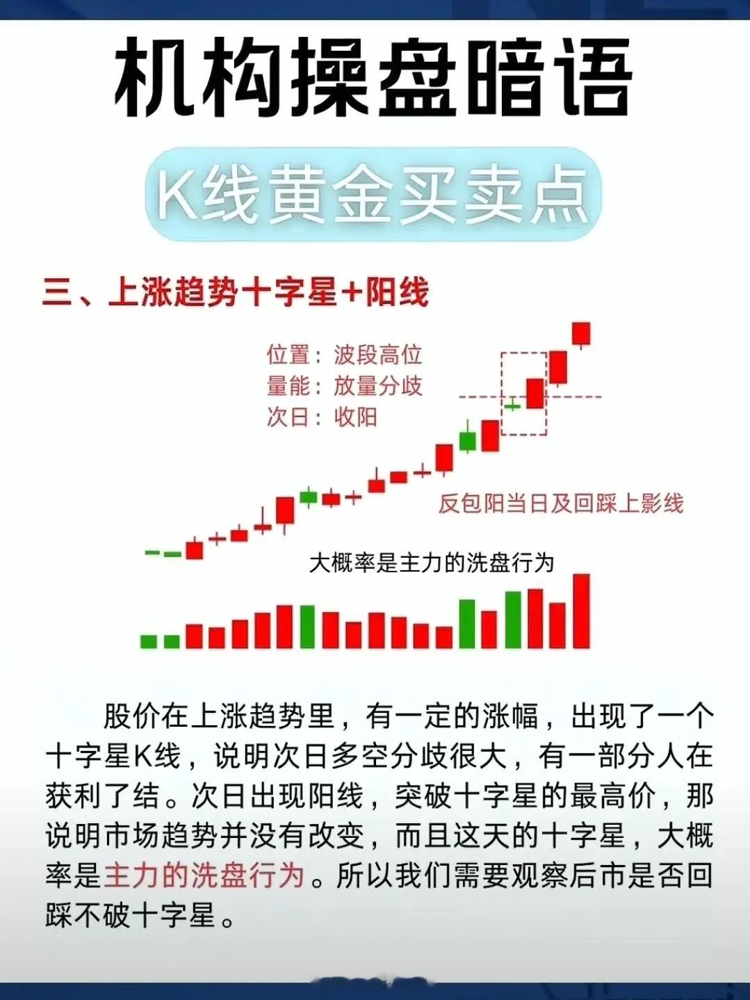 上涨趋势中十字星+阳线 这是上升趋势里最强的中继企稳信号,核心是十字星洗盘,阳线确认拉升,信号出现后延续上涨的概率极高,以下是超凝练的识别、操作要点,直接落地。 一、形态核心 1. 十字星:上升途中缩量收十字星(下影线越长越好),不破5日均线,是主力洗盘而非反转。2. 阳线:次日收放量阳线,实体覆盖十字星,最好突破十字星上影线,量能比十字星放大50%以上。3. 趋势:全程依托多头均线,无明显放量滞涨,属于强势调整后的接力。 二、实操策略 1. 持股:十字星出现时,只要均线没破,坚定拿,别被洗盘震走。2. 加仓:阳线确认当日尾盘,放量突破十字星上影线,直接轻仓加仓(1-2成)。3. 止损:跌破十字星低点或5日均线,形态失效,立刻减仓离场,止损幅度仅3%-5%。 三、避坑红线 1. 十字星放量、跌破5日均线,是真调整,不是洗盘;2. 阳线无量、实体盖不住十字星,买盘不足,大概率是假突破。 核心口诀上涨十字星缩量稳,阳线放量盖星就加仓;五日均线守得住,趋势上涨不停步。
