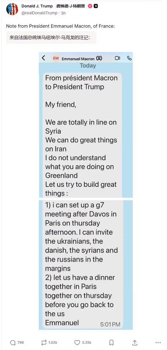 马克龙聪明反被聪明误。开大会批评美国太嚣张,没有尊重欧洲。私下却发短信给特朗普,要一起合作。属于典型的里子面子全都要。 马克龙可真是个“天才”,当着全世界的面,批评美国塑造自己的“硬汉”形象,美国也敢刚。私底下又是说好话,要攒个局一起吃饭。 但他千算万算漏算了一点,你马克龙要面,我特朗普难道就不要了吗? 看着马克龙在台上咋咋呼呼刷声望。转手,特朗普就把马克龙的短信公开了出来,敢拿我刷经验,你怕是打错了算盘! 这份短信要比马克龙的台上演讲更具有参考价值,当过美国总统、法国总统的都知道,大会上的演讲稿是经过修饰的,私底下说的才是真实的,短信有以下几个知识点: 1,欧洲清楚的知道美国想要格陵兰岛的野心, 2,欧美对于叙利亚要进行资源的瓜分, 3,对于伊朗,则是很可能要动手了。