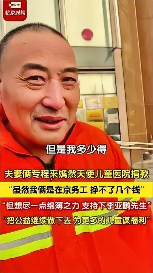 这对夫妻的“先生”,藏着最烫的真心 昨天刷到他们的视频,我盯着屏幕鼻尖发酸。 两口子是做园林绿化的,手背上还沾着早上修剪冬青的绿汁,挤了两个小时公交往嫣然医院跑——就为了把攒了半个月的零钱,亲手递到护士手里。 “我没读过多少书,但‘先生’是给干实事的人叫的。”丈夫挠着后脑勺笑,指节上的茧子泛着淡白色,“李亚鹏先生默默做了10多年公益,我和媳妇挣的是风里晒的钱,可再少,也想跟着他给孩子凑点‘抬头笑的本钱’。” 你看,最戳人的从来不是数字——是他们明明怕请假扣工钱,却还是舍得花一上午跑这一趟;是他们把“先生”俩字说得特别重,像把别人10年的付出,都装进了“敬重”两个字里。 公益哪是比谁捐得多?不过是我啃着冷馒头的时候,还想着给别人递半块热乎的。 评论区有人说:“他们的善意像‘笨笨’的种子——不是点一下转账键,是踩着泥点子赶过来,把钱放在桌上时说‘麻烦帮我告诉孩子,叔叔阿姨盼着他笑’。” 其实啊,最珍贵的善意从来都是“笨”的——要花时间,要动真心,要把自己的不容易,揉成给别人的暖。 你们最近遇过这种“笨笨”的善意吗?是楼下奶奶特意留的热粥,还是陌生人帮你扶了一把歪掉的电动车?评论区聊聊,让我也沾沾这份“笨笨的热乎气”~
