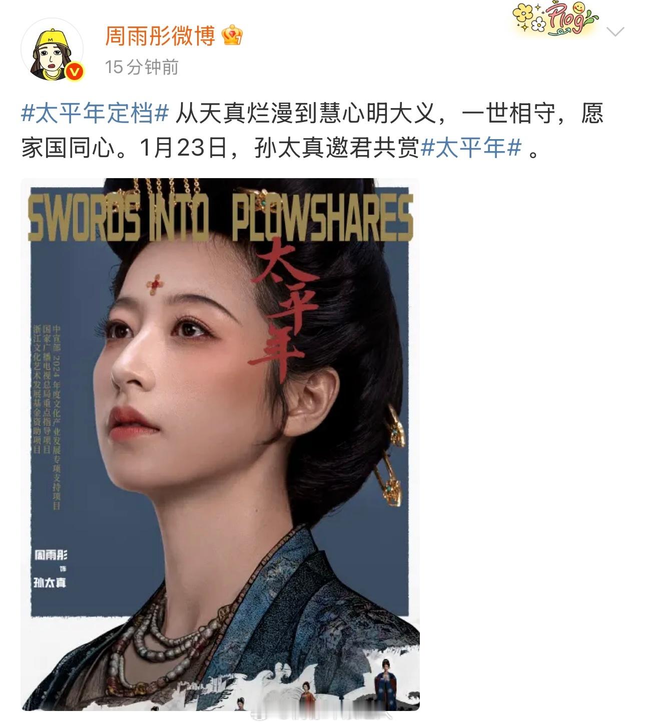 周雨彤太平年定档海报 周雨彤这张《太平年》定档海报也太好看了吧!眼神里都是故事感,把孙太真从天真烂漫到慧心明大义的变化诠释得特别好,第一眼就被惊艳到了,而且还是越看越耐看的那种!海报色调也高级,特别有质感和细节,整体氛围感直接拉满!已经开始期待了~