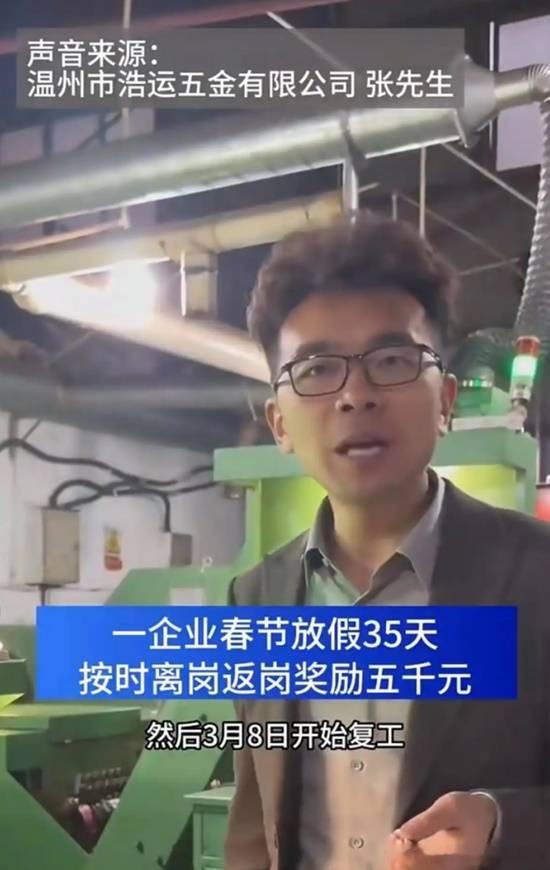 一公司春节放35天还发钱,老板:最后1个月应留给家人据海报新闻报道,最近,浙江温州一家企业的春节放假通知在网上火了。这家公司春节不仅放35天假,按时离岗和返岗的员工还能拿到5000元奖励。“该拼搏的时候,我们已经全力以赴了11个月,最后这一个月理应留给家人,用来陪伴、团圆和休整。”公司2026年春节假期定为2月1日至3月7日,共35天。所有员工按时离岗、返岗可获5000元奖励,奖金于3月底发放。针对有学龄儿童的员工,允许推迟至孩子开学后2天内返岗,仍享全额奖励。张老板坦言,公司近50%的利润都用于支付员工薪酬。“不管是工资还是红包我们都比同行高出30%以上。员工流动性很低厂里很多都是干了十几年的老员工”老板张有运的“让利共赢”哲学:早年从事销售时,他便坚持“有钱大家一起赚”,创业后延续这一思维。他认为五金行业依赖经验丰富的老师傅,高福利可稳定核心团队。早年因交通不便(员工返乡单程需3-4天)设定长假,如今虽交通改善,仍保留为福利传统,强调“拼搏11个月后,最后1个月应留给家人”。网友普遍称其为“神仙公司”,感叹“别人家的老板”,认为高福利提升员工归属感,形成“双向奔赴”。
