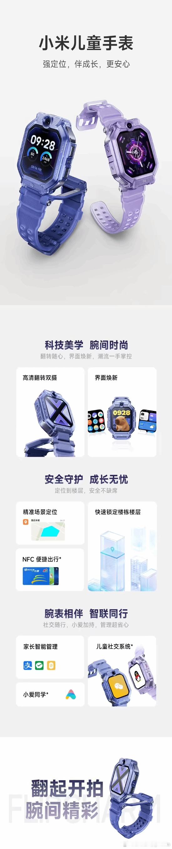 小米1399元儿童手表来了小米新推出了一款儿童电话手表,名字就叫小米儿童手表,京东显示为 1399 元,将于 1 月 27 日上市。这款儿童手表采用八向棱边创新结构、1.75 英寸 AMOLED 屏幕、16GB 内存,支持快充,配备 500 万像素 +800 万像素高清双摄(支持翻转),支持 NFC 功能(交通卡、门卡),支持支付宝、微信、QQ 等,支持 20 米防水。小米儿童手表贴合儿童使用习惯的交互设计,升级图标、色彩体系,让操作更轻便,界面更流畅;还提供了百款个性表盘,动态萌宠相伴。这款手表支持心率及心情监测、上下学守护、电子围栏、历史轨迹、一键求救等功能;支持 AI 楼层定位算法 3.0,升级秒级连续定位、智能锁楼技术,做到快速锁定楼栋与楼层,手机实时查看更放心。此外,它还支持水域提醒功能,开启该功能开关后,孩子靠近水域时会自动推送提示消息,让家长及时知晓。小米还专门专为 K12 中小学生开发了运动系统,提供 18 种运动可选,支持运动 PK,持续激发孩子的运动热情,实现突破。