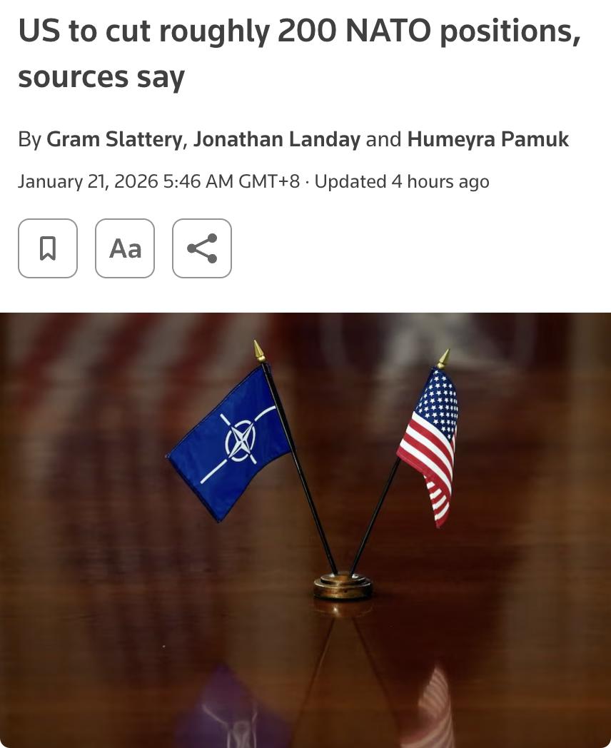 外媒:美国计划削减约200个驻北约指挥中心的岗位,这一决定已通知部分欧洲国家。受影响的机构包括英国的北约情报融合中心、布鲁塞尔的盟军特种作战部队司令部以及葡萄牙的STRIKFORNATO等。 此举并非意味着美国将大规模撤离欧洲,目前仍有约80000名美军驻扎在欧洲,其中近半数在德国。但这一决定可能会加剧欧洲对美国对北约承诺的担忧,尤其是在特朗普政府近期要求欧洲在2027年前承担北约大部分常规防御能力、并试图收购格陵兰岛引发争议的背景下。 北约方面表示,美国人员调整并不罕见,且美国在欧洲的存在规模已达到近年来的高位。