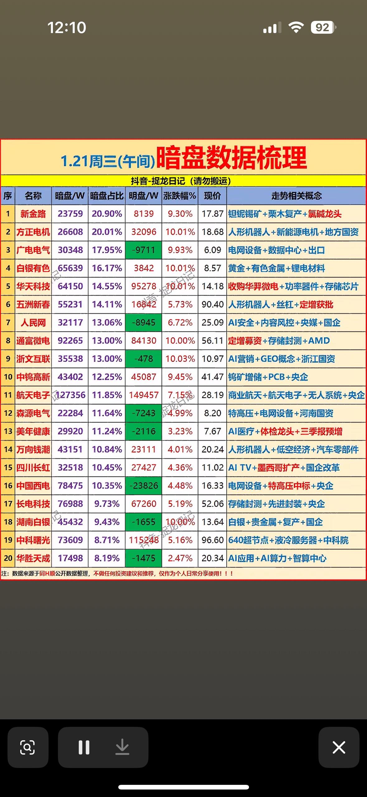 1月21中午暗盘资金梳理。 多股异动:人形机器人、AI安全、商业航天等概念活跃,部分个股涨幅显著,市场热点分散但题材丰富。
