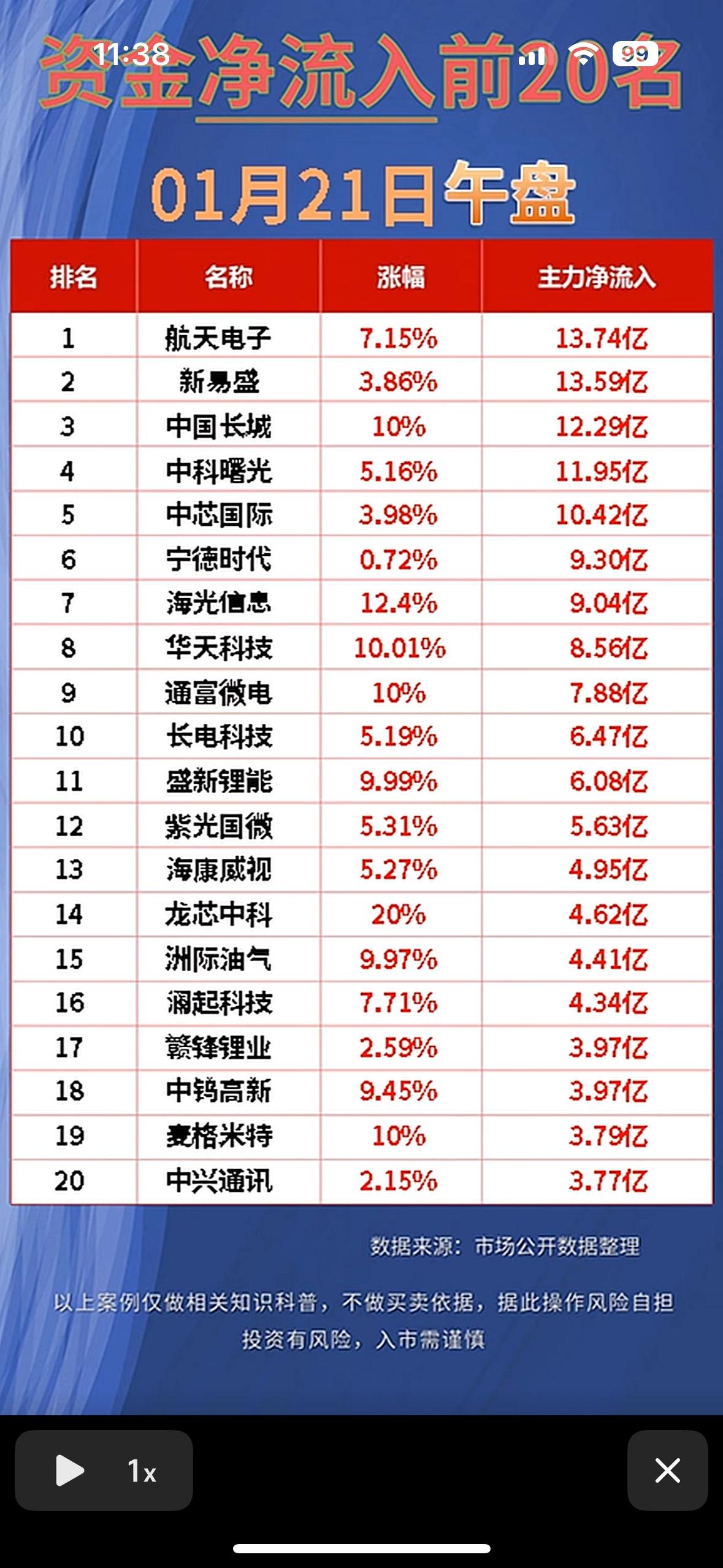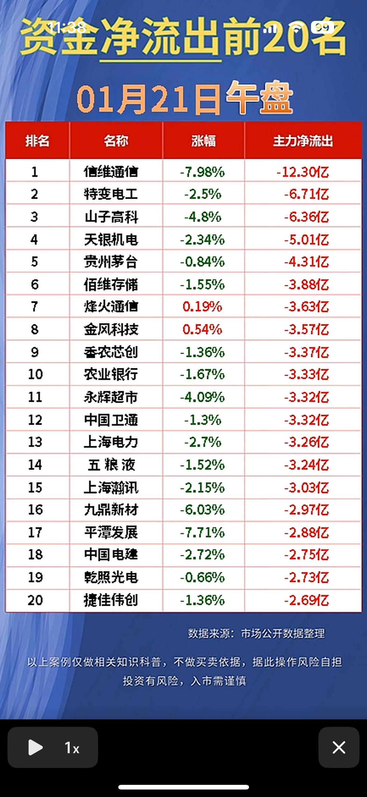 “2026年1月21日午盘资金净流出前20名”📈💰 科技股强势吸金,航天电子领跑,芯片新能源受热捧,资金扎堆龙头,市场热度攀升。