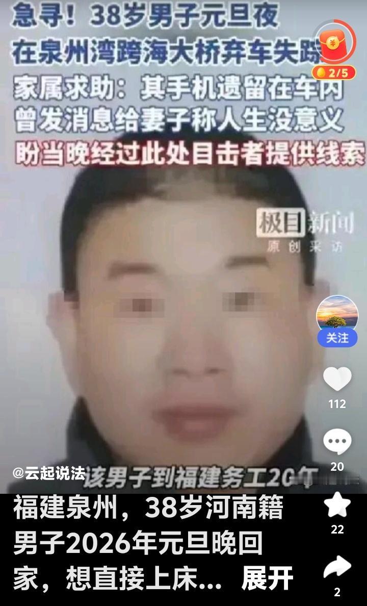 泉州湾跨海大桥深夜惊魂!38岁男子弃车留遗言失踪,妻子哭诉:只因睡前一句“洗脚吗”,20年奋斗人生瞬间崩塌?全网紧急寻人! 那个夜晚的风一定很冷。泉州湾跨海大桥上,一辆亮着双闪的汽车孤独地停在路边,发动机还在低沉地轰鸣,仿佛主人只是临时离开。车内,手机屏幕偶尔亮起,是妻子不断拨打的未接来电。而它的主人,38岁的小李,却如同被茫茫夜色吞噬,消失得无影无踪。这一切的起点,竟是一场关于“睡前是否洗脚”的夫妻争执。 妻子至今无法接受。在她看来,这只是一个寻常甚至带着关心的要求:“奔波一天,洗个脚解解乏,也干净。”但在丈夫小李耳中,或许成了压垮疲惫心灵的最后一根稻草。他愤而离家,驾车直抵跨海大桥,发出“人生没有意义”的诀别短信,将手机与过往一同遗弃在车内。决绝的背影后,是一个家庭瞬间崩塌的世界。 外人看来难以置信。亲友描述中的小李,来闽务工二十年,踏实肯干,无不良嗜好,无沉重负债,甚至攒下了购房的存款。一个似乎正稳步走向美好中年的男人,何以因一句“洗脚”的摩擦就疑似崩溃?这强烈的反差,恰恰戳中了无数中年人心底最隐秘的痛:那些被日常琐碎掩盖的,名为“情绪价值”的巨大空洞。 这绝非“洗脚”二字可以概括。它可能是无数个被忽略的疲惫瞬间的累积:是应酬后的强颜欢笑,是业绩压力下的沉默寡言,是身为儿子、丈夫、父亲却无人倾诉的孤独。妻子的要求本身并无过错,错位的或许是长久以来缺乏的深度沟通与情绪共鸣。那一句“人生没意义”,是长期情绪透支后,内心荒漠的绝望回响。 悲剧将生活的残酷剖面骤然揭开。我们总以为筑起物质的高墙便能抵御风雨,却常常忽略伴侣精神世界的阴晴。当一个人连最亲近的人都无法理解其沉重的叹息,那座名为“家”的港湾,也可能在瞬间变得陌生而冰冷。小李的失踪,是一场个体悲剧,更是一面映照现代婚姻关系中情感疏离的镜子。 网络上已议论纷纷。有人责备男子脆弱,“一点小事就扛不住”;有人批评妻子苛责,“不懂体贴丈夫的累”。然而,在真相水落石出之前,任何对当事人的简单指责都可能是另一种伤害。此刻最重要的,不是争论对错,而是汇聚力量,寻找一个可能正身处险境的生命。 截至发稿前,搜救与排查工作仍在紧张进行。泉州湾跨海大桥沿线、附近海域及小李可能前往的区域,都是搜寻的重点。警方与家属恳请当晚经过该路段的司机、附近居民,若有任何行车记录仪画面或目击线索,请立即与警方联系。您的一个信息,或许就能点亮一个家庭绝望中的希望。 这个元旦的悲剧,留给世人沉重的思考。它警示我们,在奔波劳碌的生活中,请务必看见并拥抱身边人的情绪,一句“你累了么”远比一句“你该怎么做”更温暖。真正的关爱,是看见他坚强外壳下的脆弱,理解他沉默背后的波涛汹涌。愿小李平安归来,愿这样的悲剧不再重演。 (来源:综合极目新闻、家属求助信息及网络公开报道) 中年危机 情绪价值