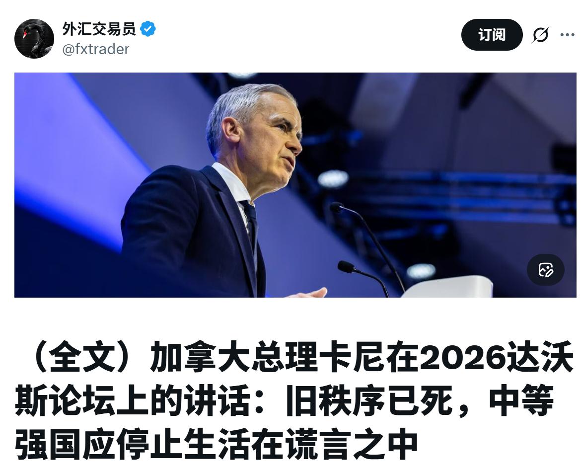 加拿大总理还算是清醒, 他发表演讲:旧秩序已死, 中等强国应停止生活在谎言之中, 这个世界又回到了弱肉强食的丛林时代了。