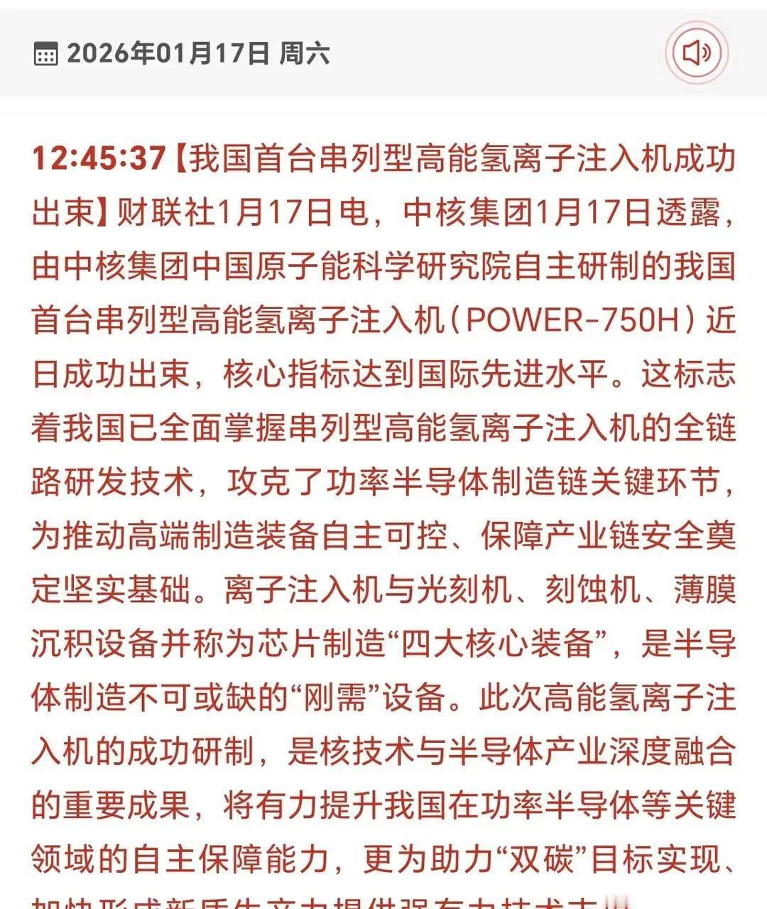 这几天都在传半导体设备有利好,很多人只盯着光刻机,其实真正的釜底抽薪,是在另一个看不见的地方 中核集团这回搞出来的“高能氢离子注入机”,听着名字拗口,说白了,就是造芯片流程里,一道绕不开的关键工序,以前这玩意儿只有国外能造,人家想怎么拿捏就怎么拿捏 现在,我们自己不仅造出来了,水平还直接顶到国际先进 这感觉就像下棋,对手堵死你一条路,你却从棋盘的另一端悄悄突围了,而且一出手就是将军 这步棋走得真提气,靠自己,腰杆子就是硬,有些事,还真就急不来,也挡不住