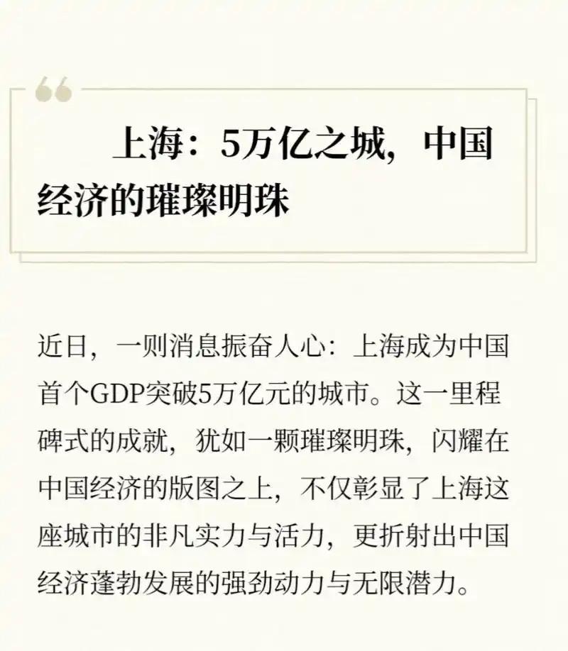 中国第二个5万亿城市诞生!京沪双城破局,这才是普通人的红利密码 “中国第二座5万亿城市来了!”1月21日北京GDP突破5.2万亿的消息刷爆全网与上海5.67万亿的成绩并肩,让“5万亿俱乐部”正式迎来双巨头。这两个数字有多震撼?放在国内,堪比安徽、河北一省的经济体量;放到全球,能轻松挤进前25位,比肩瑞典、比利时等发达国家,真正做到了“富可敌国”。 但比起冰冷的数字,更戳普通人的是:这两座城市的5万亿,到底靠什么撑起来?又能给我们的生活带来多少实在好处? 很多人以为京沪是靠“堆资源”,但真相藏着城市发展的底层逻辑。上海的5万亿,是汽车、人工智能、生物医药、金融贸易的“多点开花”,长三角完整的产业链让每一个产业都能强强联合;而北京走的是另一条路——放弃传统工业,专攻高端服务业,第三产业占比超85%互联网产业增加值超万亿,字节、京东美团等巨头撑起半壁江山,金融业贡献超8000亿,再加上近4000亿的科技服务业,三大支柱就撑起了城市经济的脊梁。 更难得的是,5万亿的增长红利,真真切切落到了老百姓身上。北京居民人均可支配收入冲到89090元,农村居民收入增速甚至超过城镇;上海人均可支配收入更是高达91987元,城镇调查失业率稳定在4.2%。我们能感受到的,是街头越来越多的新能源汽车、越来越便捷的政务服务、周末爆满的博物馆和健身房——服务性消费占比突破59.8%,恰恰说明大家的日子不仅富了,更有品质了。 有人会问:京沪越来越强,其他城市还有机会吗?其实这不是“零和博弈”,而是中国经济的“领头雁效应”。北京的科创资源、上海的贸易优势,正在通过京津冀、长三角协同发展,带动周边城市共同成长。就像互联网、金融这些高端产业,不仅创造了高薪岗位,更催生了无数上下游机会,哪怕是二三线城市的创业者,也能借着这股东风分一杯羹。 如今的5万亿,不是天花板,而是新起点。当我们为京沪喝彩时,其实也是在为自己的未来期待——城市越强大,我们的机会就越多,生活就越有底气。你觉得下一个加入“5万亿俱乐部”的会是哪座城市?你所在的城市正在靠什么发力?评论区聊聊你的看法,一起见证中国城市的下一个奇迹!