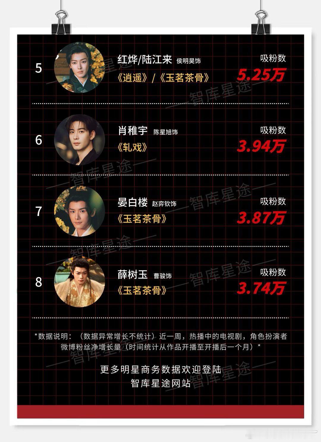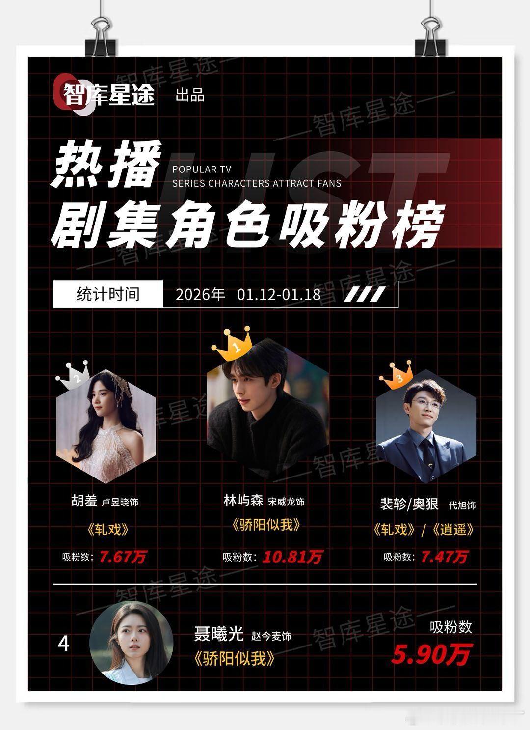 智库星途 热播剧集角色吸粉榜统计时间 2026年0112-0118骄阳似我 宋威龙/林屿森 赵今麦/聂曦光轧戏 卢昱晓/胡羞 代旭/裴轸 陈星旭/肖稚宇逍遥/玉骨茗茶 侯明昊/红烨/陆江来 赵奕钦/晏白楼 曹骏/薛树玉