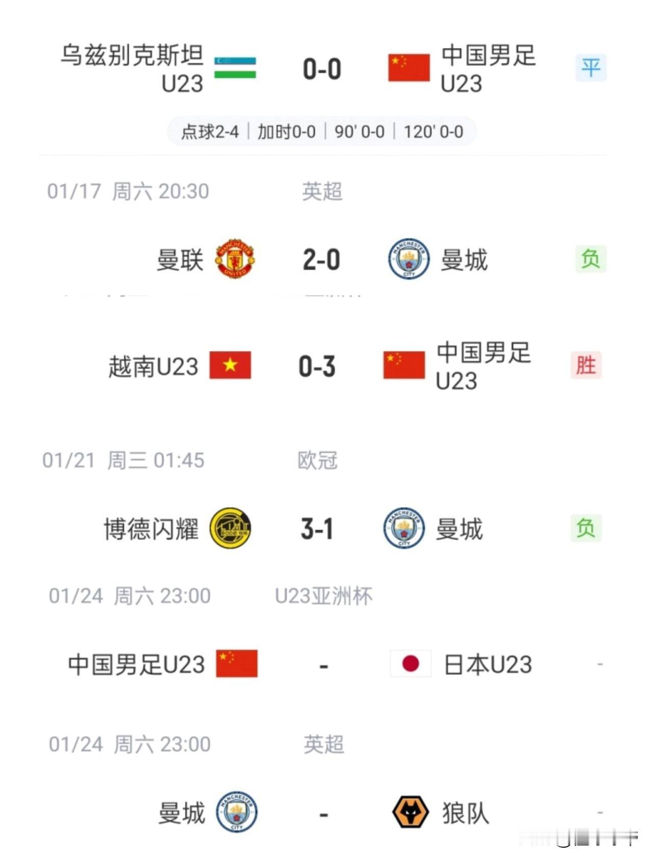 U23国足能不能夺冠,就看曼城会不会输给狼队了! 在上周六的时候,U23国足在亚洲杯1/4决赛中点球大战淘汰了强大的乌兹别克斯坦,曼城则0-2输给了曼联。 在昨天晚上,U23国足在亚洲杯半决赛中3-0大胜越南,曼城则在欧冠联赛1-3爆冷输给了博德闪耀。 本周六,U23国足又要在亚洲杯决赛上对阵日本对了,巧合的是当天晚上曼城又要和狼队踢比赛了,而且比赛还是同时开始,看来只要曼城输给狼队,国足就一定能战胜日本队夺冠了。 毕竟曼彻斯特的天空是红色的,我们中国足球也是红色的。