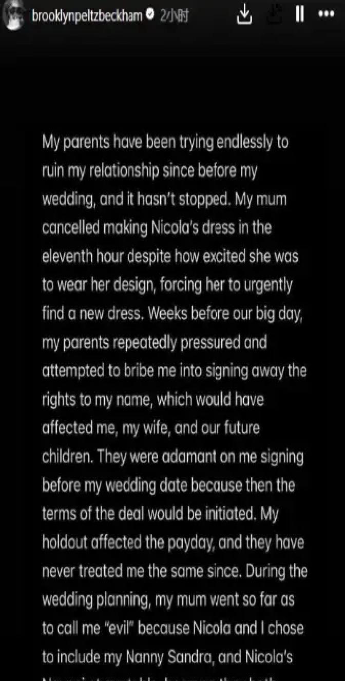 儿子买豪宅 选在了岳父母家隔壁。 自己亲爹妈的房子 却好像成了“最遥远的距离”。 贝克汉姆和维多利亚最近提起孩子 只反复夸赞小七、罗密欧和克鲁兹。 那个曾经最受瞩目的大儿子布鲁克林 名字仿佛成了“禁语”。 布鲁克林刚在洛杉矶买了套千万美元的宅子。 步行几分钟 就能到妻子妮可拉父母的家。 而他回英国看望自己父母的次数 一只手数得过来。 有网友说: “这还不能说明问题吗? 心早就偏了。 ” 也有网友反驳: “从小被宠到大的孩子 一出问题就怪父母 这才是巨婴。 ” 一边是试图保持体面 却难掩失落的巨星父母。 一边是把婚姻压力归咎于“原生家庭溺爱” 并身体力行保持距离的29岁儿子。 一场关于家庭教育与成年责任的全民辩论 在这明星家庭的沉默中震耳欲聋。 究竟是父母的“爱”错了方式? 还是孩子的“独立”选错了方向? 评论区 等你评理。