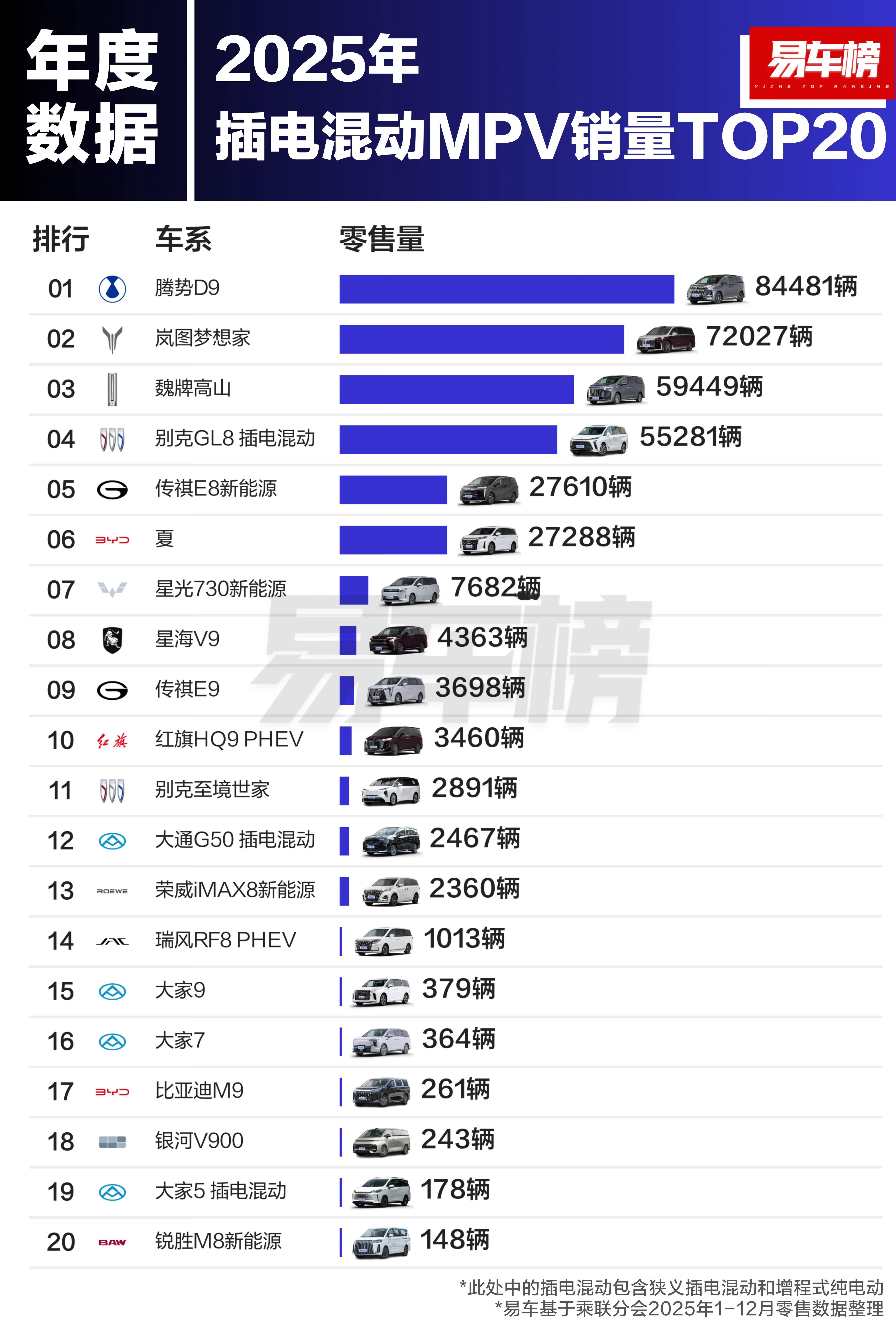 2025年插混MPV销量TOP20新鲜出炉!腾势D9直接断层夺冠,84481辆的成绩一骑绝尘,妥妥的家用&商务双料王!岚图梦想家、魏牌高山紧随其后,7万+、5万+的销量,国产高端MPV彻底支棱起来!别克GL8插混也稳得一批,传统豪门实力依旧在线!传祺E8、夏、星光730、星海V9、传祺E9、红旗HQ9 PHEV也都杀疯了,每一款都是出行的真香选择!TOP20里,你最喜欢哪一款?插混mpv腾势d9岚图梦想家魏牌高山别克gl8汽车销量 要不要我帮你再写一个更有梗、更适合年轻人转发的搞笑版文案?