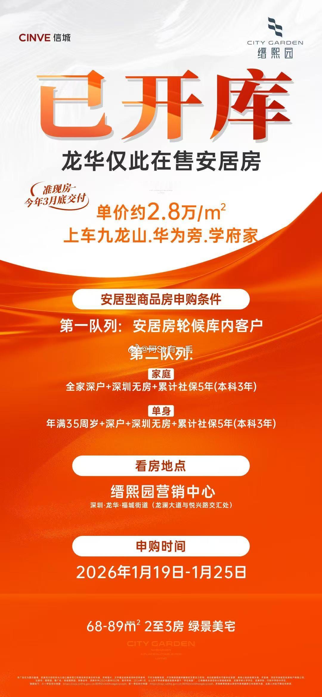 龙华唯一在售安居商品房「信城缙熙园」开库了,位于九龙山数字城,与华为为邻,周边迈瑞/传音/富士康已入驻,是新一代高新产业人才聚居之地。单价约2.8万低门槛上龙华九龙山数字科技城板块,两房总价192万,首付29万;三房总价251万,首付38万。均为准现房,今年买今年住, 2026年3月31日精装交付。周边生态环境很好,半山半城,挨着九龙山森林公园/龙华环城绿道,部分户型阳台可望茜坑水库,推窗即就是山景,楼下还有公园。住宅非超高层,容积率仅3.58,3梯8户,四叶草格局,赠送后实用率超80%,在当下的商品房市场中也尽显优势。交通方面:龙澜大道连接观光路、福龙路,通过福龙立交快速通达南山、福田。教育方面:幼儿园到高中一站式教育配套,跟华为子弟同圈层;1.5km涵盖九年一贯制的行知学校、福城实验学校,高中龙华科技实验高级高中、深圳第二外国语等。本次申购开放第二队列:全家深户+5年社保(人才3年以上)+5年内无房,单身满35周岁;年后即将放开第三队列:进一步放宽只要有一人深户、单身30岁以上就可以购买,有意向的话也可以看房,留一个名额年后直接上车深圳安居房安居房保障性住房深圳楼市深圳