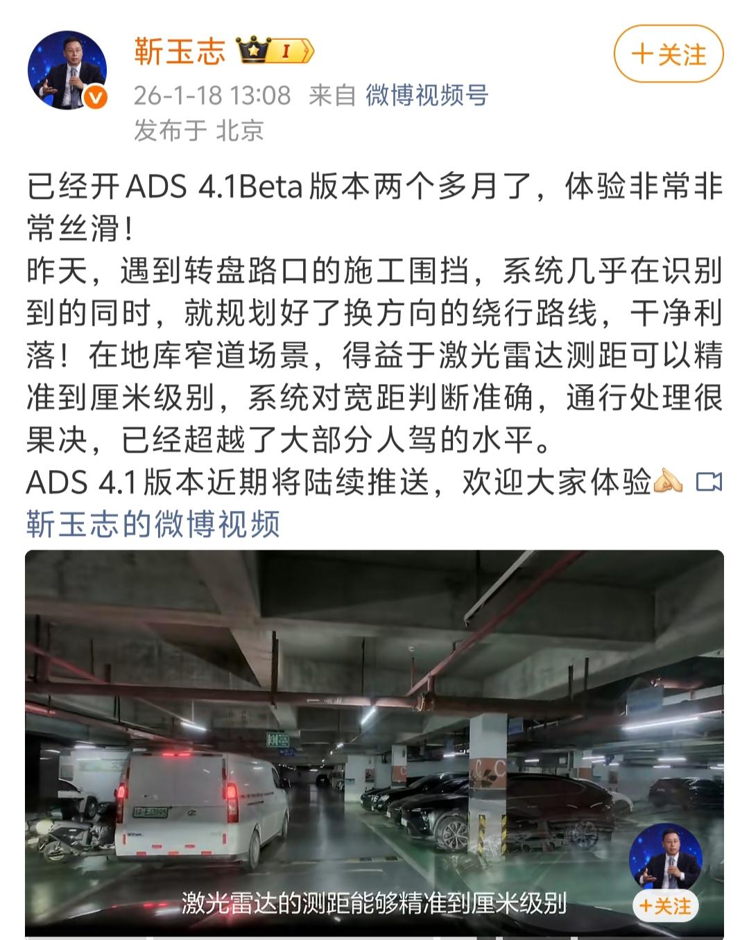 华为乾崑ADS 4.1 beta版本终于开启分批推送了,1月30日前可望完成大规模覆盖并于春节前全量推送。推送前,华为技术有限公司副总裁、华为智能汽车解决方案BU CEO靳玉志作为华为ADS 4.1 Beta版的内测用户,已经亲自体验了两个多月,他表示这套系统非常丝滑。 靳玉志分享了ADS 4.1 Beta版的两个典型场景,一是在夜间遇到转盘路口施工时,系统几乎在识别到围挡的瞬间,就规划好了绕行路线,整个操作干净利落;二是在地下车库的窄道场景里,依靠激光雷达厘米级的精准测距,系统能准确判断可通行宽度,降速后从容通过,表现已经超过了大部分人工驾驶的水平。 根据华为鸿蒙智行的升级公告,ADS 4.1系统已经于1月20日开始推送,这次升级在多个维度带来了体验的全面提升。 在驾驶体验上,系统大幅减少了重刹和幽灵刹车的发生,加减速变得更线性,顿挫感明显降低;脱手检测的间隔也被延长,缓解了驾驶疲劳;同时修正了偏右行驶的问题,车辆走线更居中稳定。路口减速的逻辑也更自然,小路口通行效率提升,环岛和无保护左转的动作也更丝滑,绕行动作更快更持续,不再贴着路沿极限转弯。 交互与导航方面,新增了支持百度、高德双地图的车道级导航,地图信息更完整精细;红绿灯显示也做了优化,能同时显示当前和下一个路口的状态;仪表盘UI变得更简洁,减少了视觉干扰。此外,还增加了场景化提醒,比如雨天、湿滑路面会主动语音提示限速,在国道、省道检测到行人或非机动车时会自动鸣笛提醒。 泊车功能做了更名,还优化了车位到车位的辅助,园区内选好车位后系统会自动规划路线并转向泊入。新增了窄区域泊车能力,能在30米范围内自动将带货箱车型的货箱倒进指定区域并精准调整;360°全景影像画面更清晰,还移除了冗余显示元素;代客泊车增加了二次确认弹窗,防止误操作;测试中的车级导航功能,未来还将支持全场泊车、自动找车位及远程召唤。 全维防碰撞系统CAS 4.0整合了增强型eAES 2.0,扩展了对异形物体的感知范围;新增了乡村道路牛、狗等动物的识别与避让能力;驾驶员失能辅助可以在检测到驾驶员昏迷后自动靠边停车,并收紧安全带尝试唤醒;还加入了防误踩加速踏板、三点式掉头、爆胎稳控辅助2.0等功能,进一步提升了全场景安全性。SR渲染也升级了,可渲染外卖骑手、交警、特殊车辆及特殊车道等等。 看来,华为ADS虽然迫于无奈曾经放慢脚步,但不会停下来。华为 华为入局智驾的鲶鱼效应 拥有一台华为的车是什么体验? 华为智能化方案对汽车行业有何影响 华为乾崑 华为高阶ads