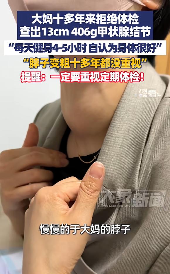 “太吓人了!”近日,浙江杭州,一大妈十几年前脖子变粗,但每次都拒绝体检,慢慢地,大妈脖子鼓起了个小皮球大的包,直到最近出现呼吸困难才就医,一检查,才知道脖子的大包是甲状腺结节,并且长到了13厘米!严重压迫气管和血管!   近日浙江杭州,有位于大妈,这段时间彻底后悔坏了,就因为自己十几年的一个倔脾气,差点把命搭进去。   说起来也挺让人无奈的,十几年前,于大妈就发现自己的脖子慢慢变粗了,一开始只是一点点,不疼不痒,也不影响吃饭睡觉,她就没往心里去。   家里人看在眼里,急在心里,好几次劝她去医院做个体检,看看到底是怎么回事,可每次都被她拒绝了。   更何况于大妈平时特别爱运动,每天都要坚持运动4到5个小时,自认身体特别康健,总觉得体检就是浪费钱、瞎折腾,还总跟家里人说“我身体好得很,一点事儿没有,不用去医院遭那个罪”。   说白了,就是抱着侥幸心理,觉得只要不疼不痒,就不会有大问题。   就这么一年又一年拖着,大妈脖子上的包越来越大,从一开始的轻微变粗,慢慢鼓成了小皮球那么大,穿衣服都遮不住,低头抬头都觉得费劲,可她还是没当回事,依旧拒绝去体检。   直到最近一段时间,大妈开始频繁觉得呼吸困难,有时候喘口气都费劲,稍微活动一下就喘不上来,这才慌了神,被家里人紧急送到了医院。   一检查,结果出来后,不光大妈自己吓懵了,家里人也都慌了。   原来她脖子上那个小皮球大的包,是甲状腺结节,而且已经长到了13厘米,重达406克,严重压迫到了气管和血管,这也是她呼吸困难的原因。   医生说,还好送来的不算太晚,要是再拖下去,气管被压迫得更严重,随时可能有生命危险。   后来医院给于大妈安排了手术,成功把这个巨大的结节切除了,现在大妈已经顺利出院,慢慢恢复了活力。   其实于大妈的经历,真的给很多人敲了个警钟。   可能很多人都有跟于大妈一样的想法,觉得身体没疼没痒,就没必要去医院体检,可往往就是这种侥幸心理,把小问题拖成了大麻烦。   甲状腺结节这种病,早期大多没什么明显症状,就像于大妈这样,一开始只是脖子变粗,很容易被忽视。   而且临床上大多数甲状腺结节都是良性的,只要早期通过体检发现,定期复查或者简单治疗,就不会发展到这么严重的地步。   医生也说过,高分辨率超声是检查甲状腺结节最简便、最有效的手段,检出率能高达50%,很多细小的结节都能被发现。   其实体检花不了多少钱,也费不了多少时间,却能及时发现身体里的潜在问题,避免小病变大病。   我觉得,于大妈的例子真的值得大家反思,尤其是中老年人,千万不能忽视身体的细微变化,也别再拒绝体检了。   身体的小信号,往往是疾病的预警,及时检查、及时干预,才是对自己的身体负责。   很多人觉得自己身体好,就心存侥幸,可疾病从来不会因为你身体好就绕道走,有时候,一次体检,可能就能避免一场大病,挽救一条生命。   对此您有什么不同的看法,可以在评论区留言讨论!!!   信息来源:《浙江杭州,大妈十多年来拒绝体检,查出13厘米 406克甲状腺结节:每天健身4-5小时 自认为身体很好,提醒:一定要重视定期体检》大象新闻