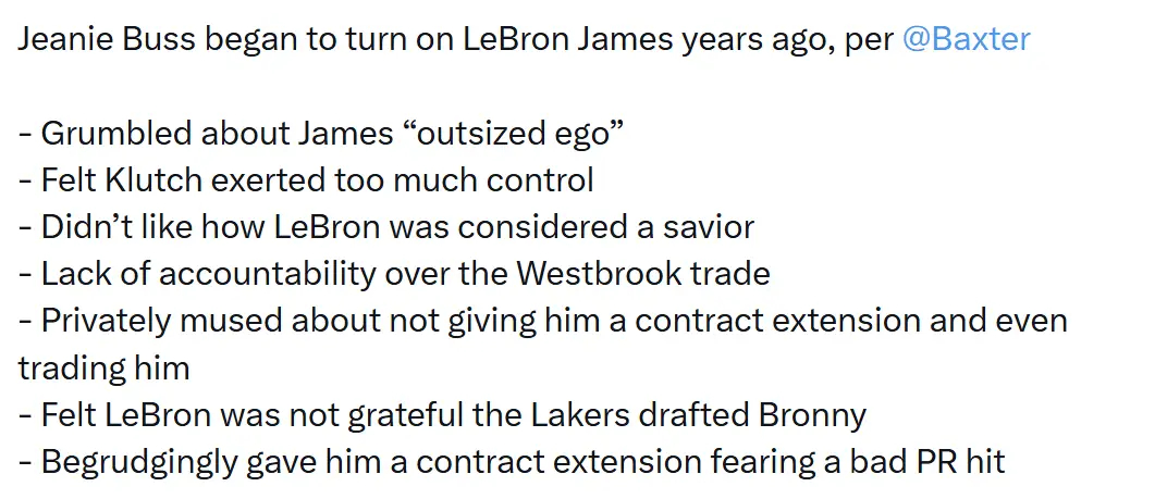 ESPN记者Baxter Holmes报道,湖人老板珍妮-巴斯近年来在内部对勒布朗-詹姆斯的态度逐渐转冷,原因涉及权力边界、更衣室观感以及球队决策等多个层面。报道披露,巴斯的不满主要集中在以下几点:-认为詹姆斯的“个人影响力与自我意识过于膨胀”-觉得Klutch Sports对球队事务施加了过多影响-不喜欢外界将詹姆斯视为“拯救湖人的救世主”-对拉塞尔-威斯布鲁克交易后的责任归属问题感到不满-私下曾考虑不再为詹姆斯提供续约,甚至讨论过交易他的可能性-认为詹姆斯并未对湖人选中布朗尼-詹姆斯表现出足够的感激-最终仍勉强同意续约,主要担心拒绝续约会带来严重的公关风险还好巴斯家族马上滚粗了屁事是真多。湖人