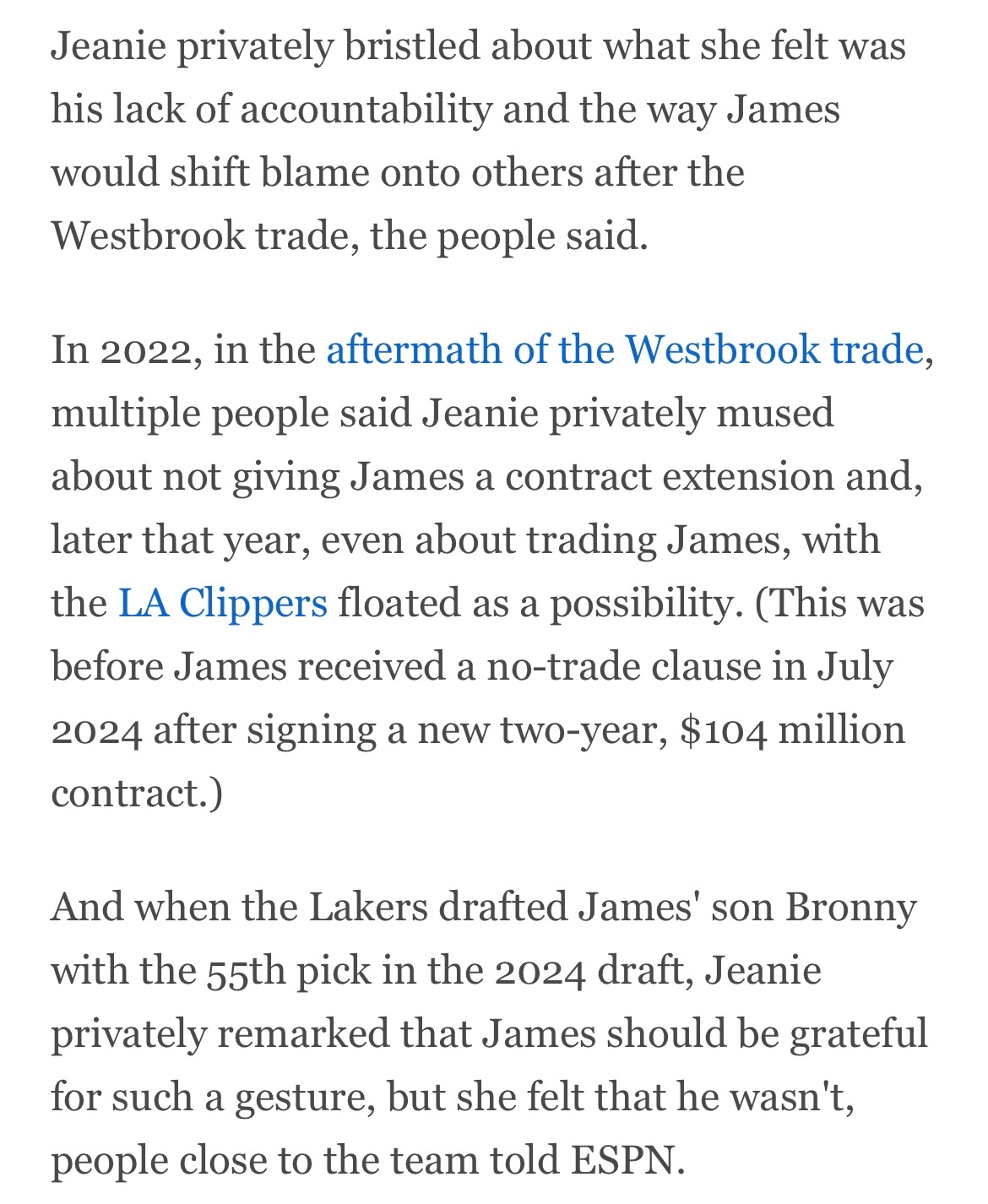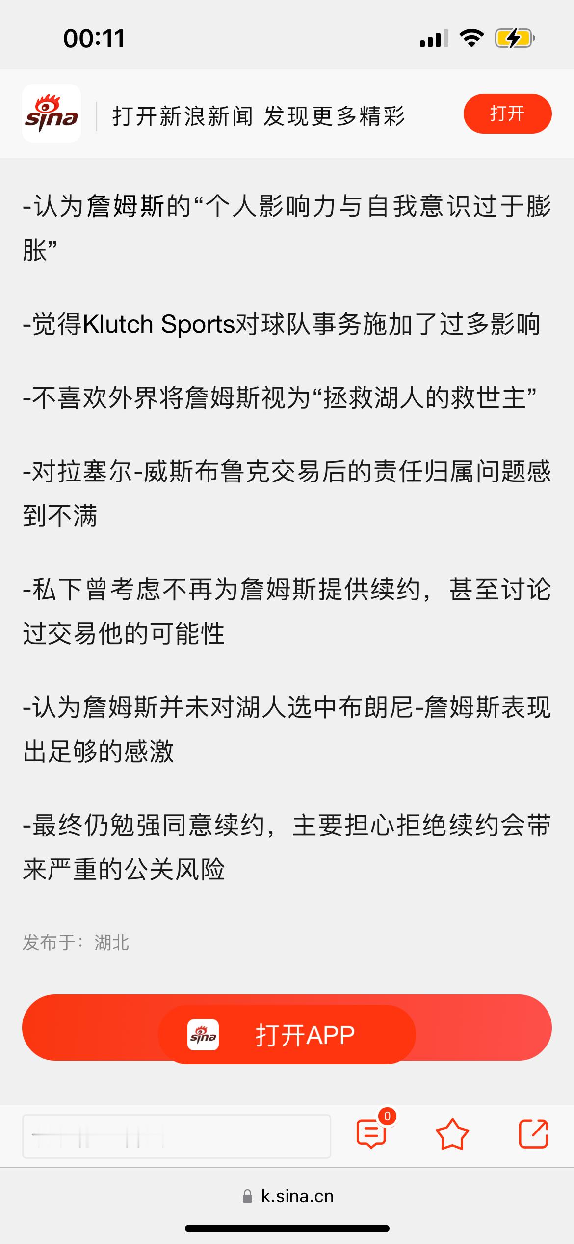 霍姆斯发布了一篇关于巴斯家族和湖人的长文,也提到了有关珍妮和詹姆斯。有关珍妮和詹姆斯的内容,总结如下:珍妮认为詹姆斯的自我意识过于膨胀;觉得富保罗对球队事务施加了过多影响;不喜欢外界将詹姆斯视为湖人的救世主;威斯布鲁克交易后的责任归属问题感到不满;私下曾考虑不再为詹姆斯提供续约,甚至讨论过交易他的可能性,最终仍勉强同意续约,主要担心拒绝续约会带来严重的公关风险;认为詹姆斯并未对湖人选中布朗尼表现出足够的感激。 真正的湖人队蜜,就是能始终站在球队角度,并且总是能和管理层想法一致。这名记者有关上述内容的报道也应证了去年夏天湖人不和詹姆斯探讨续约地决定,并不是一时的冲动,而是积压了几年的心存芥蒂所引发的必然事件,且这一重大决定,一定是得到了新老板沃尔特的批准认同,沉默就是最好的答案。詹蜜也不要咒珍妮下台,因为詹姆斯一定会在珍妮走之前离开湖人。如果没有意外,这或许就是詹姆斯在湖人的最后一个赛季。但我想说的是,如果你是真正湖人的球迷,你就绝不会因此而埋怨湖人,更不会因为詹姆斯的离开从而失去对湖人的热爱。最后,我要引用魔术师在节目中轰开聊到詹姆斯和威少在交易前,相互通电话一事,来粉碎詹姆斯团队“BOSS直聘”的推脱责任谎言,网页链接。湖人国度LakeShow