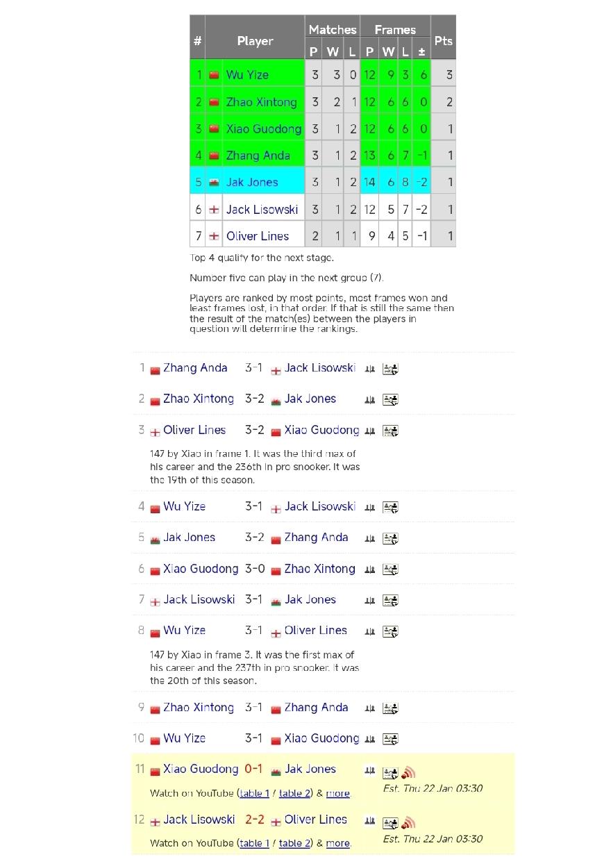 中国球员排名小组前四! 1月22日,斯诺克冠军联赛第六小组循环赛战罢10场。吴宜泽、赵心童、肖国栋、张安达暂列小组积分榜前四。 肖国栋对阵奥利弗·莱恩斯是打出生涯第三杆147! 今晚将决出第六小组冠军!