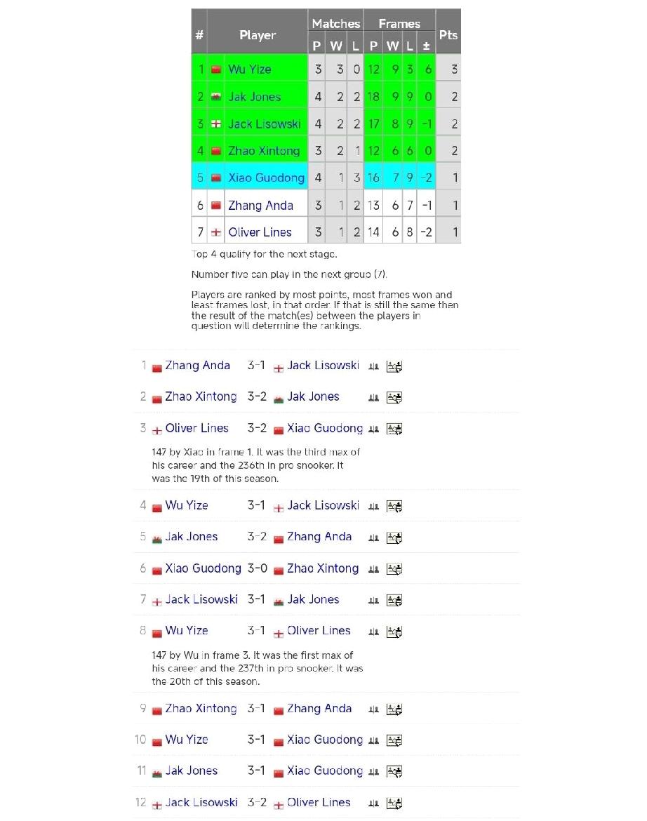 吴宜泽暂居小组第一! 1月22日,斯诺克冠军联赛第六小组第一天12场比赛全部结束。 排行榜,吴宜泽三战三胜,排名第一。杰克琼斯、杰克利索夫斯基和赵心童排名2-4位,肖国栋、张安达排名5-6位。