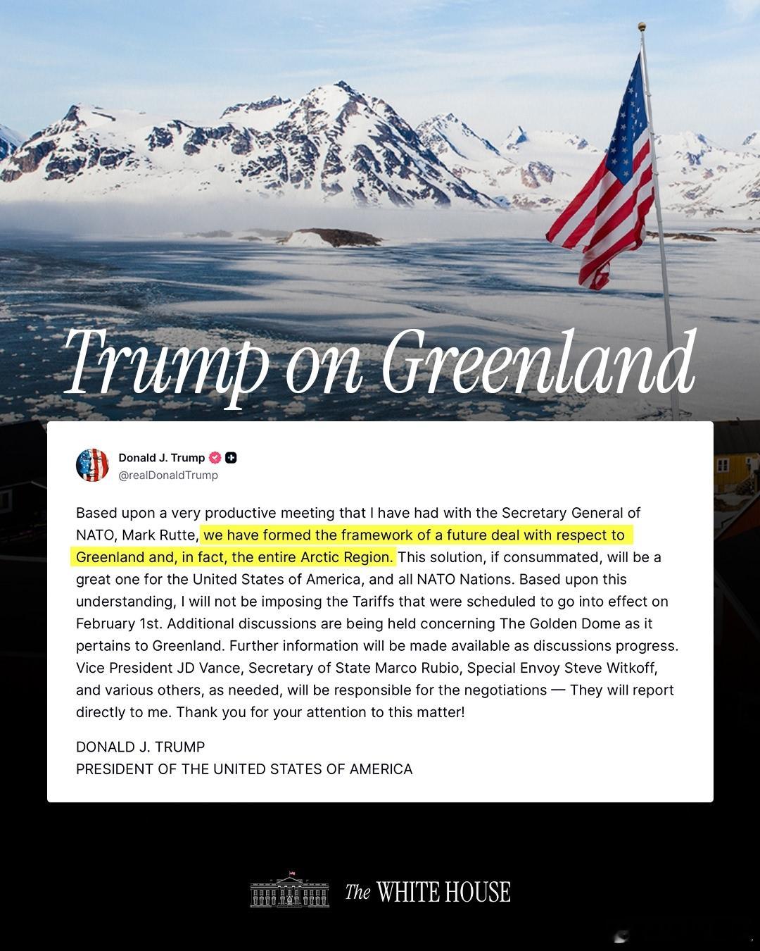 未发一枪一弹,格陵兰大抵是沦陷了,被北约出卖。懂王:“在与北约秘书长马克·吕特进行了富有成效的会面后,我们为未来关于格陵兰岛乃至整个北极地区的协议奠定了基础。如果这一决定能够落实,将对美国和所有北约国家大有益处。基于这一认识,我将不会实施原定于2月1日生效的关税。目前,有关格陵兰岛‘金色穹顶’项目的进一步讨论正在进行中。随着讨论的推进,我们将提供更多信息。副总统杰伊·迪恩斯、国务卿马可·鲁比奥、特使史蒂夫·维特科夫以及其他必要人员将负责谈判工作——他们将直接向我汇报。感谢大家关注此事!”欧洲35国排除美国组建新群聊 欧洲多国派兵支援格陵兰岛