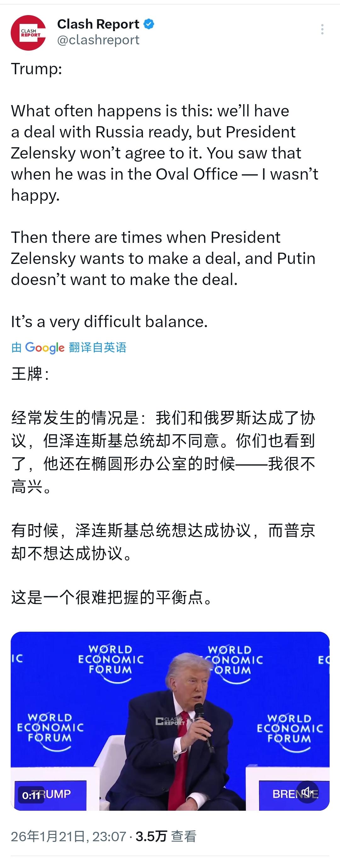 特朗普在达沃斯论坛上表示:“经常发生的情况是:我们和俄罗斯达成了协议,但泽连斯基总统却不同意。你们也看到了,他在椭圆形办公室的时候——我很不高兴。 有时候,泽连斯基总统想达成协议,而普京却不想达成协议。 这是一个很难把握的平衡点。” [机智]评几句:特朗普轻描淡写将俄乌和谈的僵局归咎于泽连斯基与普京,刻意抹去美国在俄乌冲突中拱火递刀的核心角色,仿佛自己只是个无辜的旁观者。特朗普口中“很难把握的平衡点”,不过是为美国单边操控局势、牺牲乌克兰利益谋私利的借口,既暴露了他对他国主权的漠视,也凸显了美国一贯的霸权逻辑——把别国的命运当作博弈筹码,把自身的利益凌驾于和平之上,这番说辞只会让国际社会愈发看清美国在冲突中的真实嘴脸。