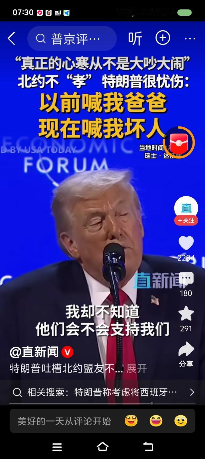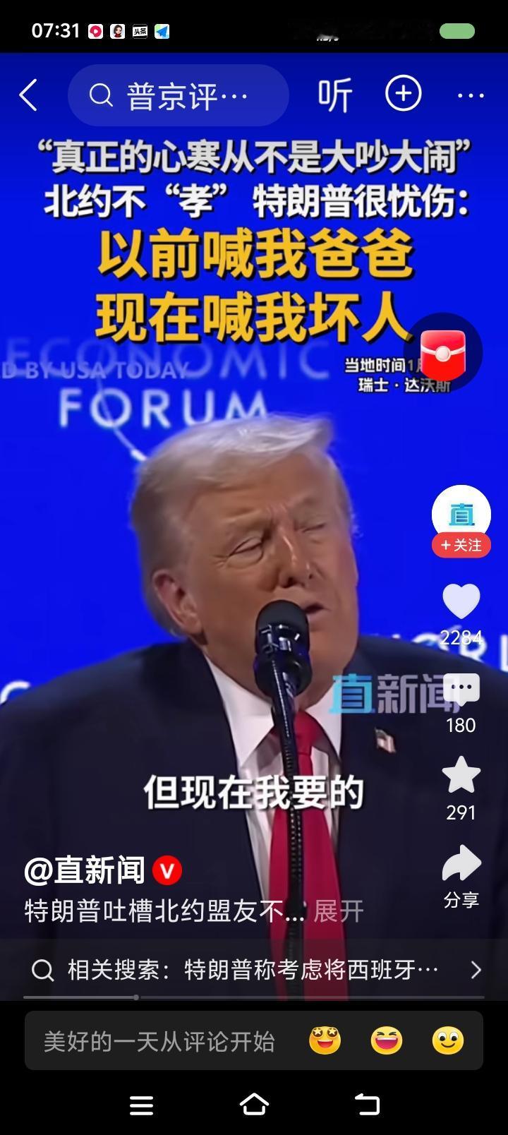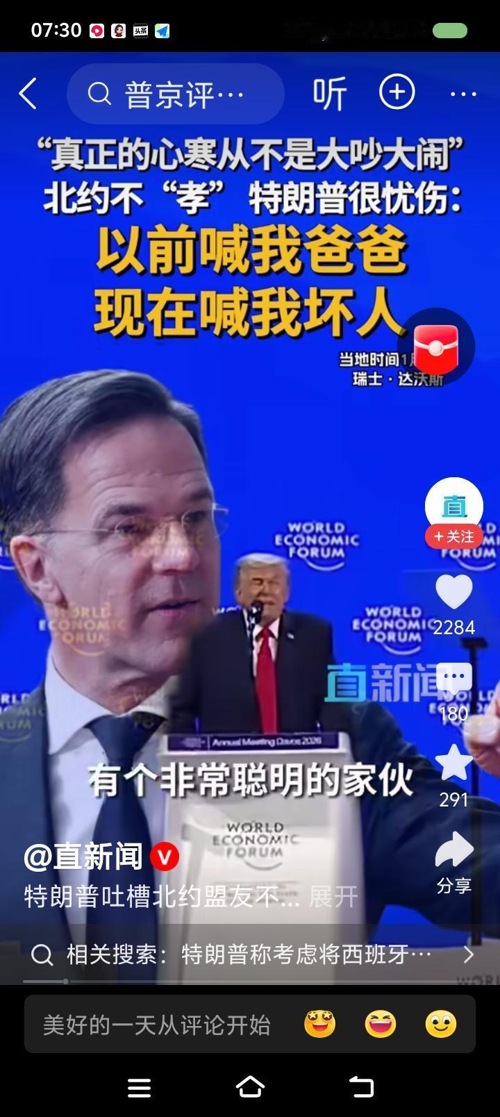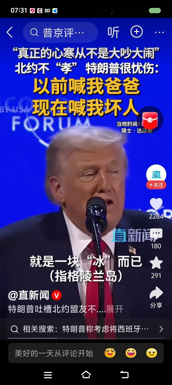 特朗普,不要撒娇、撒泼!—— 据报道,近日,世界经济论坛上,特朗普又给北约“上课”了:“之前,他们叫我爸爸,有个聪明人真这样叫了,意思是让我掌握一切;现在喊我坏人!美国一直支持北约,这么多年花了这么多钱,可北约支持我吗?我只要一块冰(格陵兰岛)而已。” 点评: 有个网友评论:“以前叫我小甜甜,现在喊我牛夫人!” 问题是,小甜甜、北约、欧盟以及喊他爸爸的那个聪明人都是妖精。 据报道,特朗普公布了北约秘书长发给他的私密信息,称愿意帮助美国拿下格陵兰岛。 这么一来,“坏人”=“爸爸”!特朗普的抱怨是在演戏? 更致命的是,欧盟有官员表示,无意挑起争端,但坚持立场。呵呵,人家刺刀到你胸膛了,你说“无意起争端”?有人要抢你房子,这叫财产纠纷?