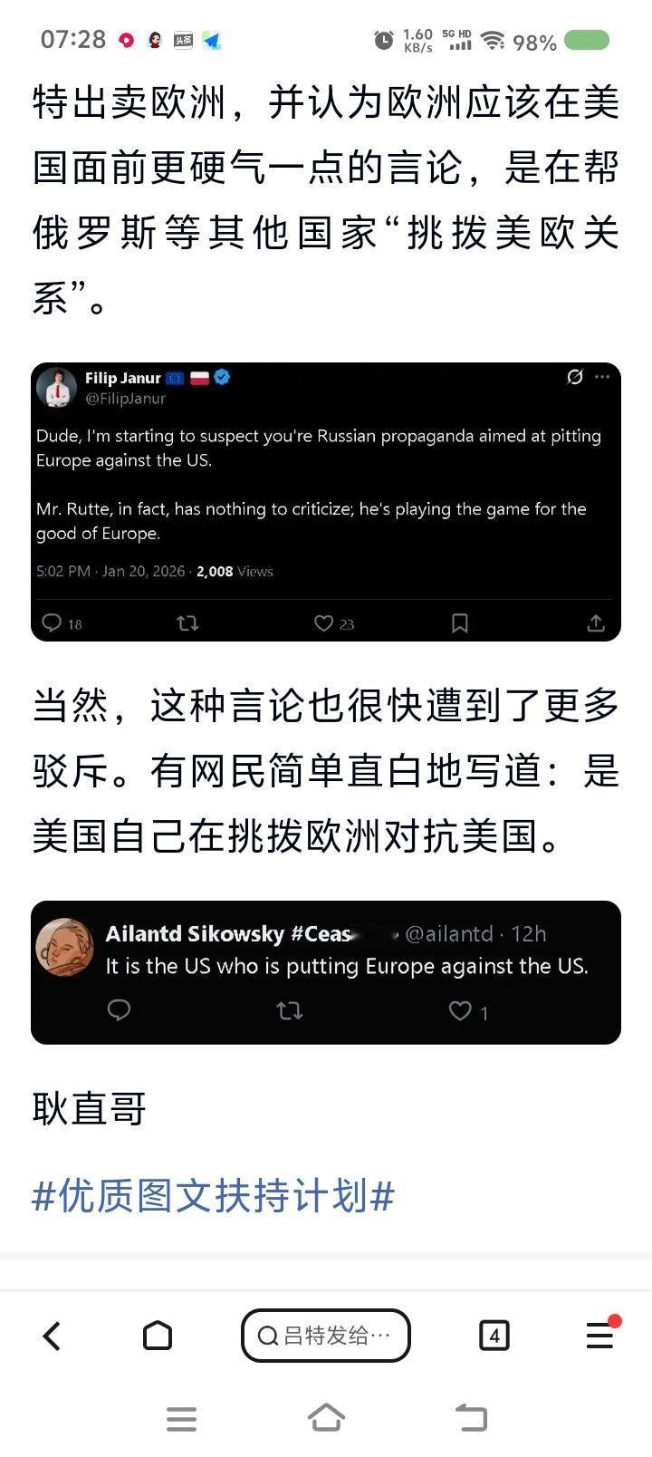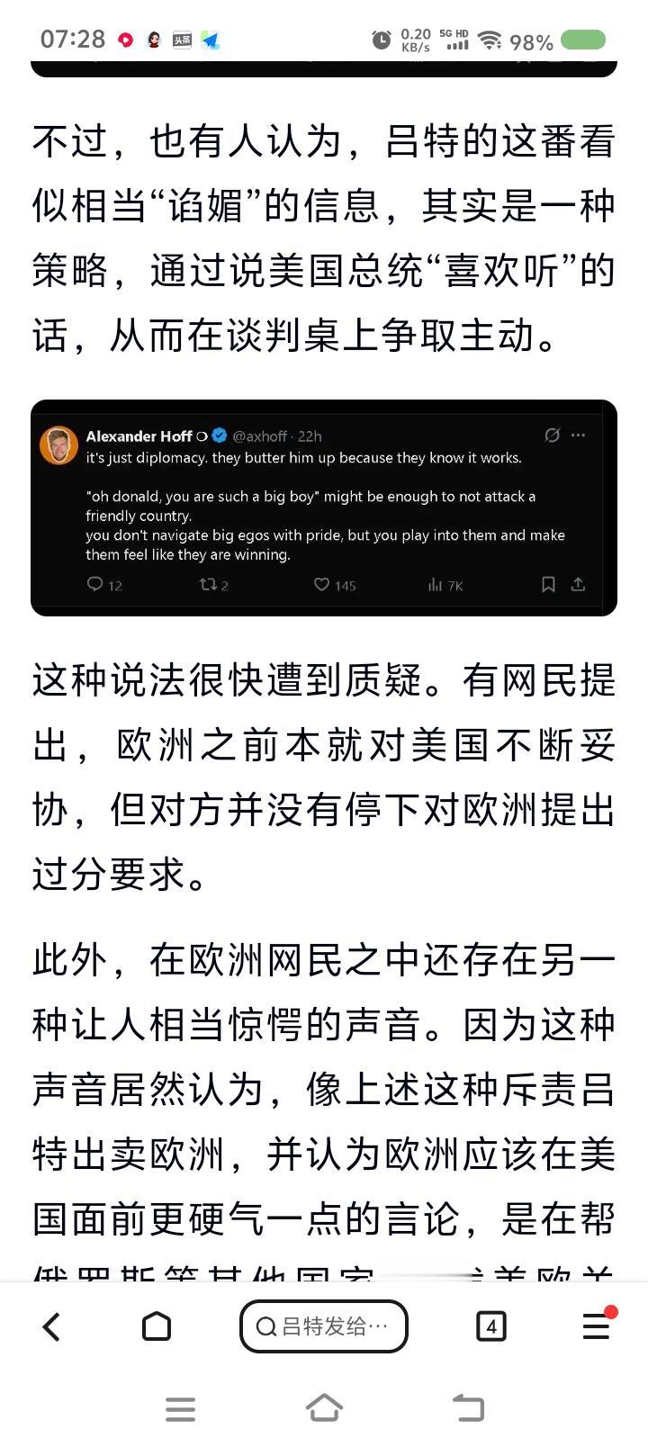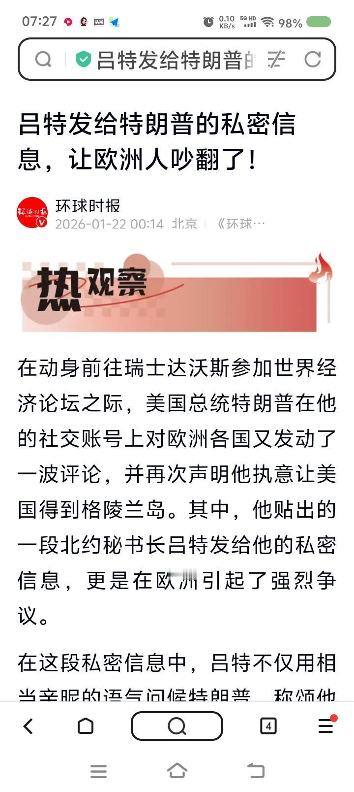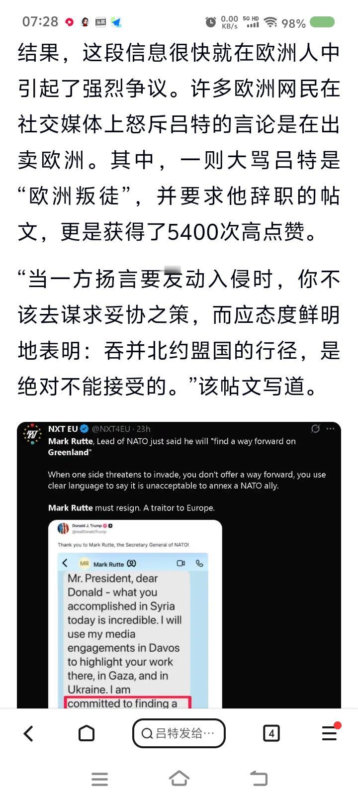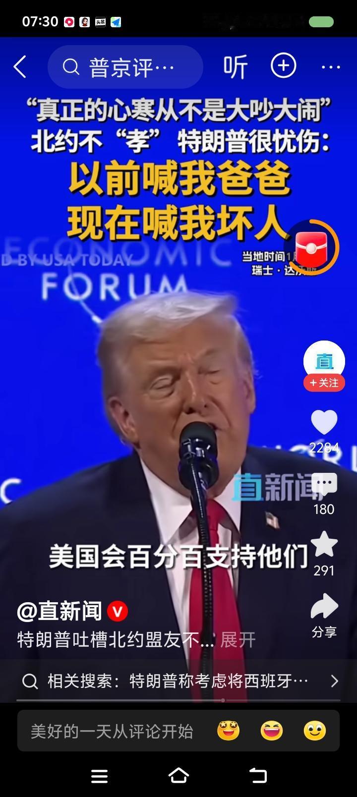 特朗普,不要撒娇、撒泼!—— 据报道,近日,世界经济论坛上,特朗普又给北约“上课”了:“之前,他们叫我爸爸,有个聪明人真这样叫了,意思是让我掌握一切;现在喊我坏人!美国一直支持北约,这么多年花了这么多钱,可北约支持我吗?我只要一块冰(格陵兰岛)而已。” 点评: 有个网友评论:“以前叫我小甜甜,现在喊我牛夫人!” 问题是,小甜甜、北约、欧盟以及喊他爸爸的那个聪明人都是妖精。 据报道,特朗普公布了北约秘书长发给他的私密信息,称愿意帮助美国拿下格陵兰岛。 这么一来,“坏人”=“爸爸”!特朗普的抱怨是在演戏? 更致命的是,欧盟有官员表示,无意挑起争端,但坚持立场。呵呵,人家刺刀到你胸膛了,你说“无意起争端”?有人要抢你房子,这叫财产纠纷?