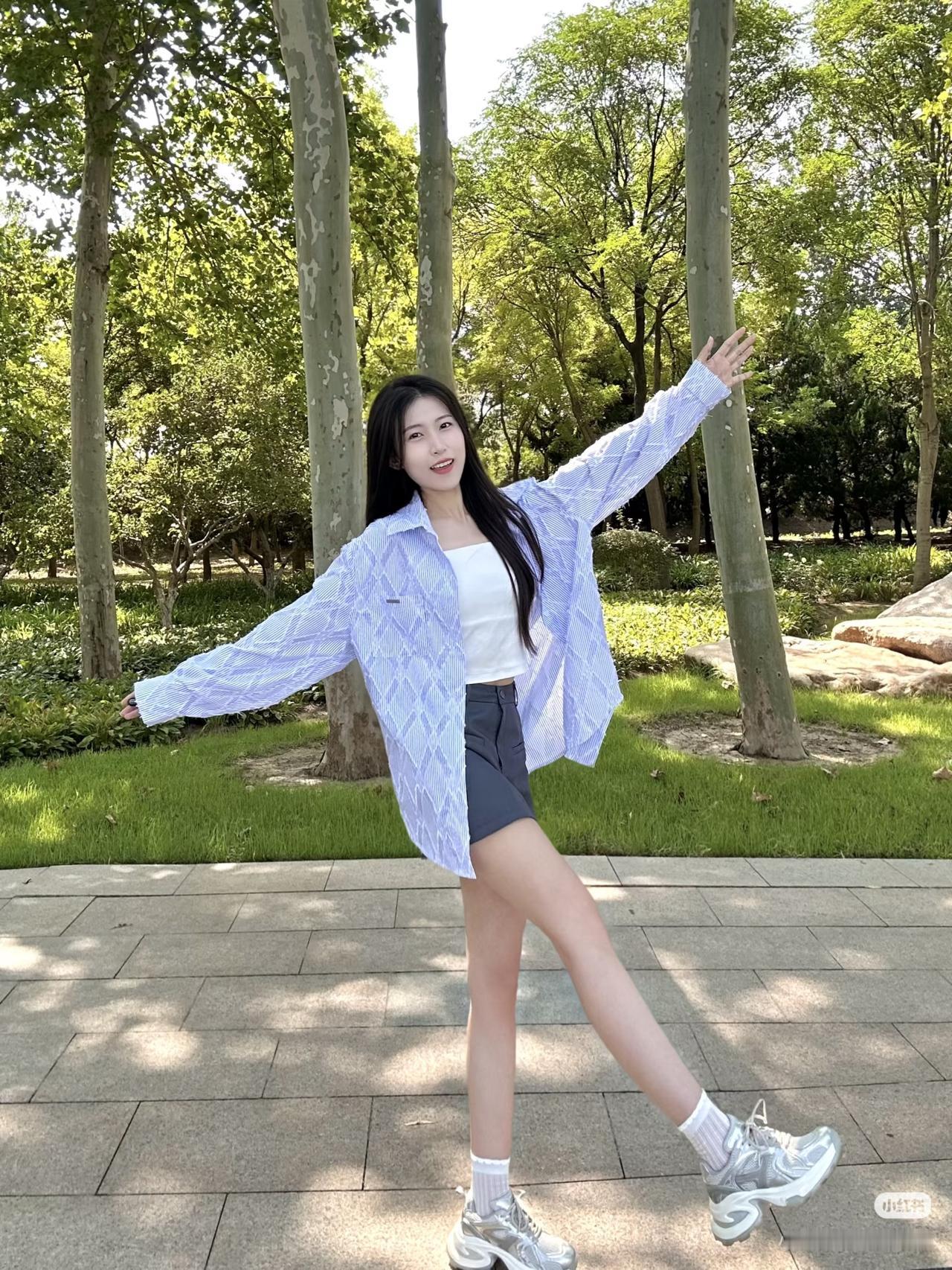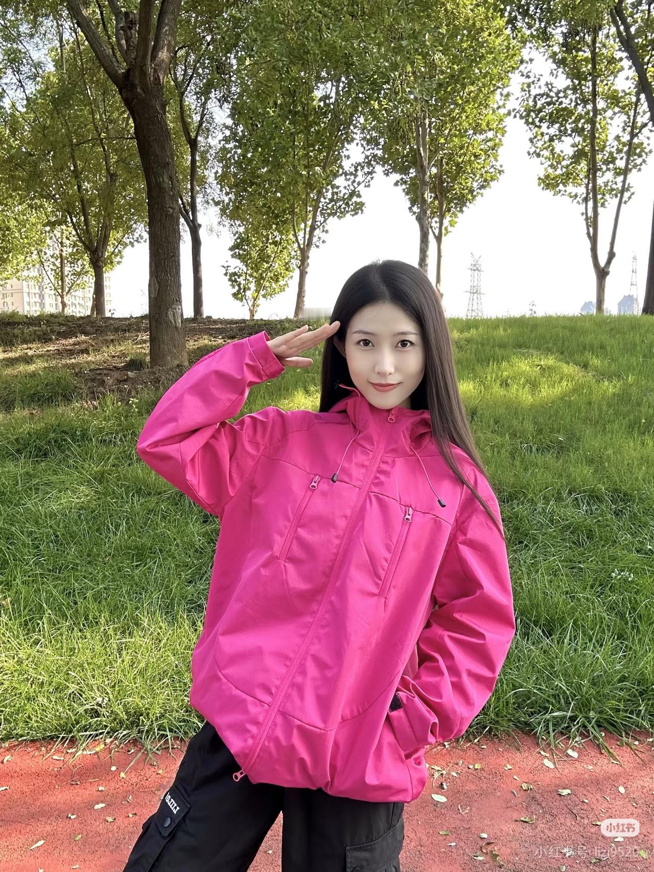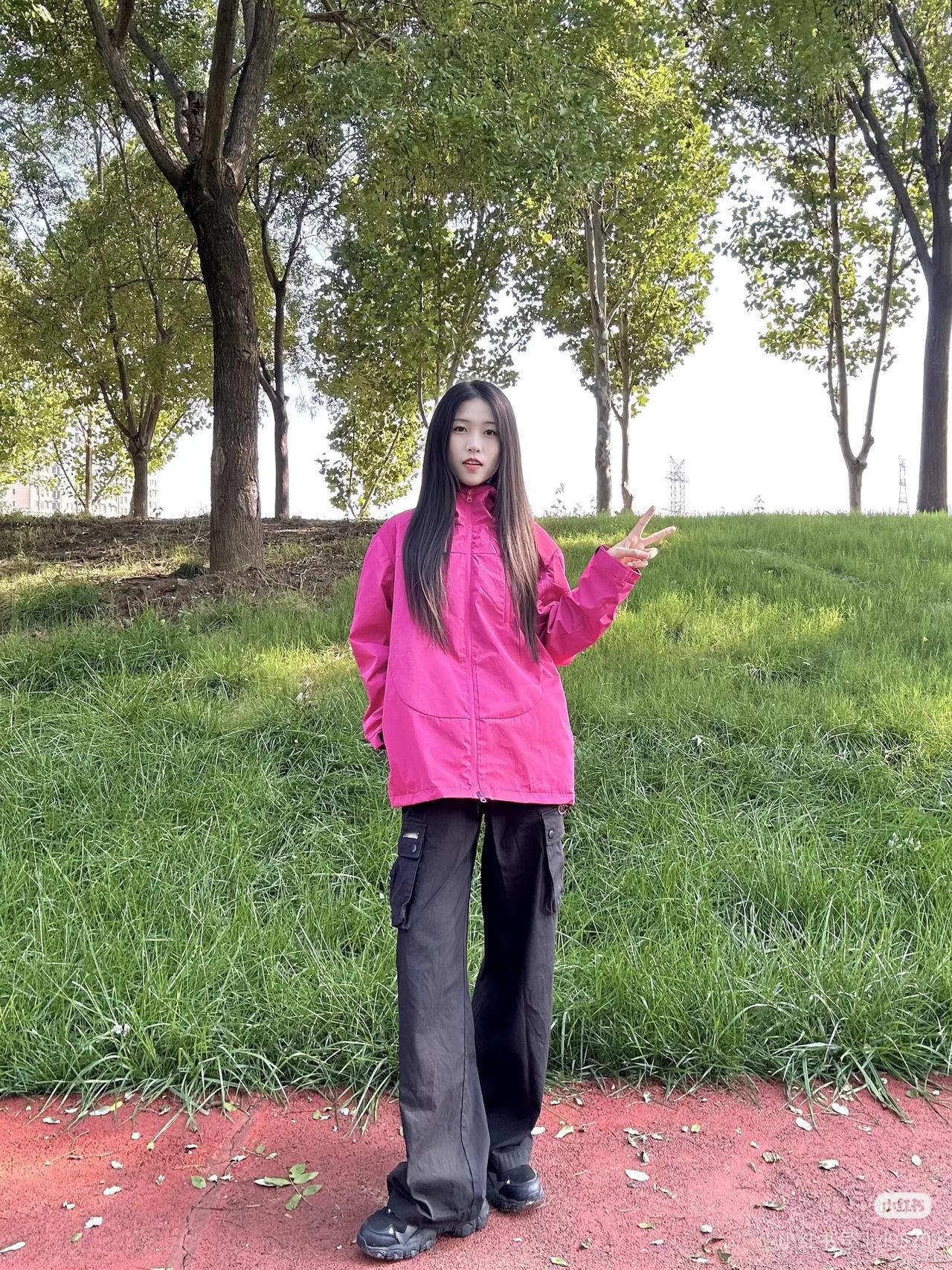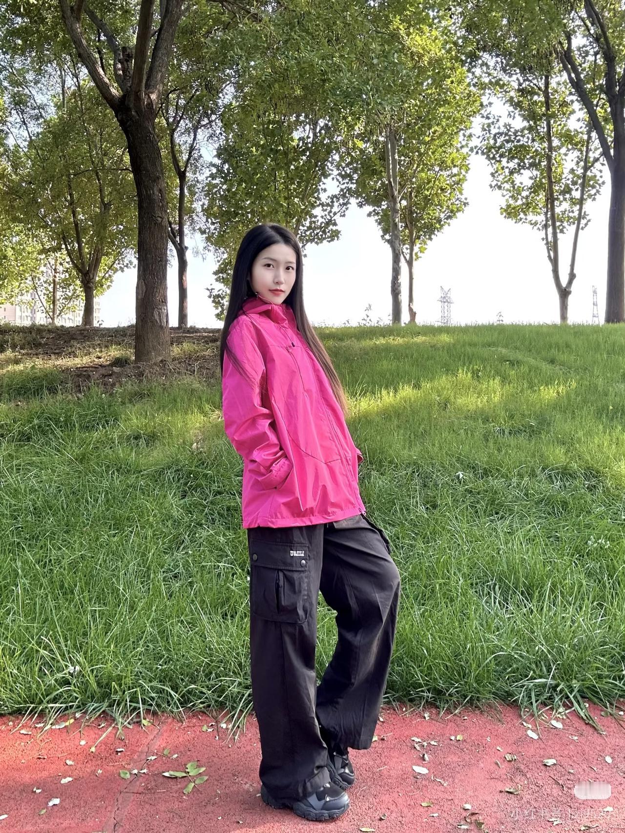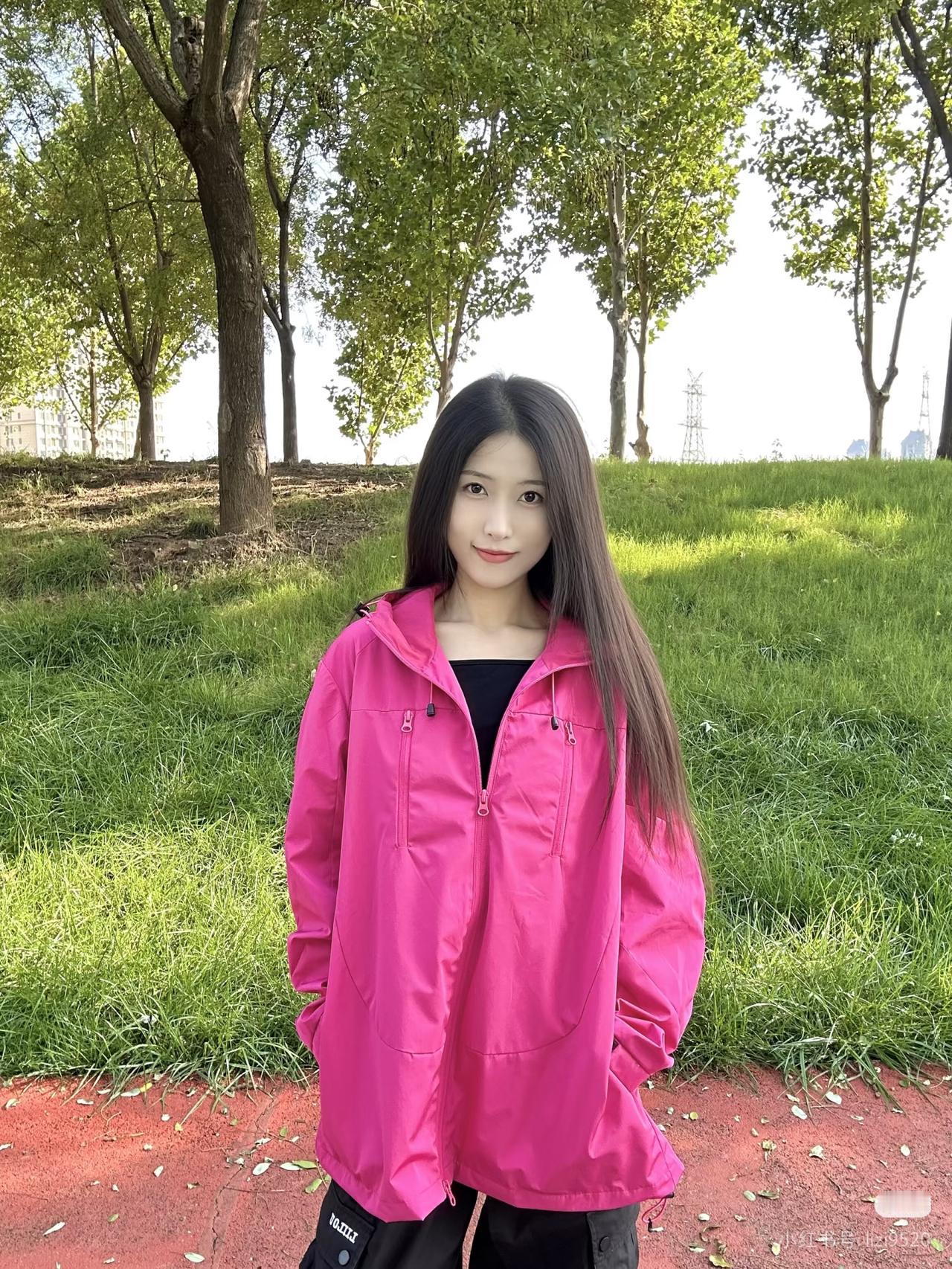 粉衣少女立林间,绿树掩映似画卷。