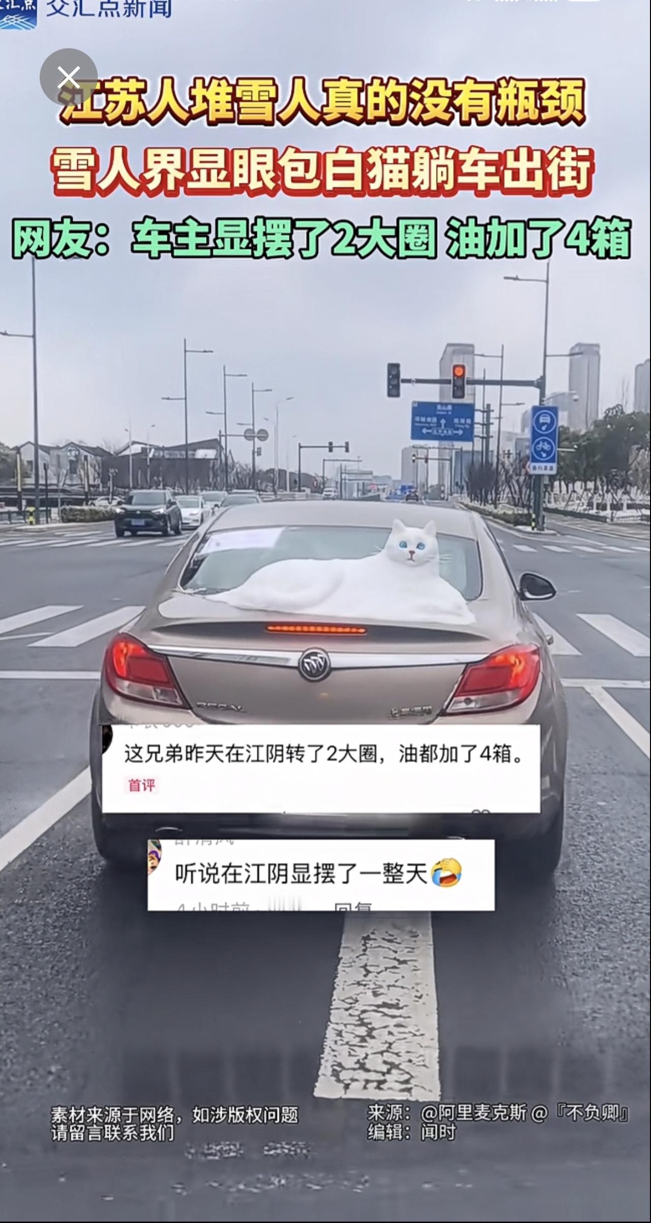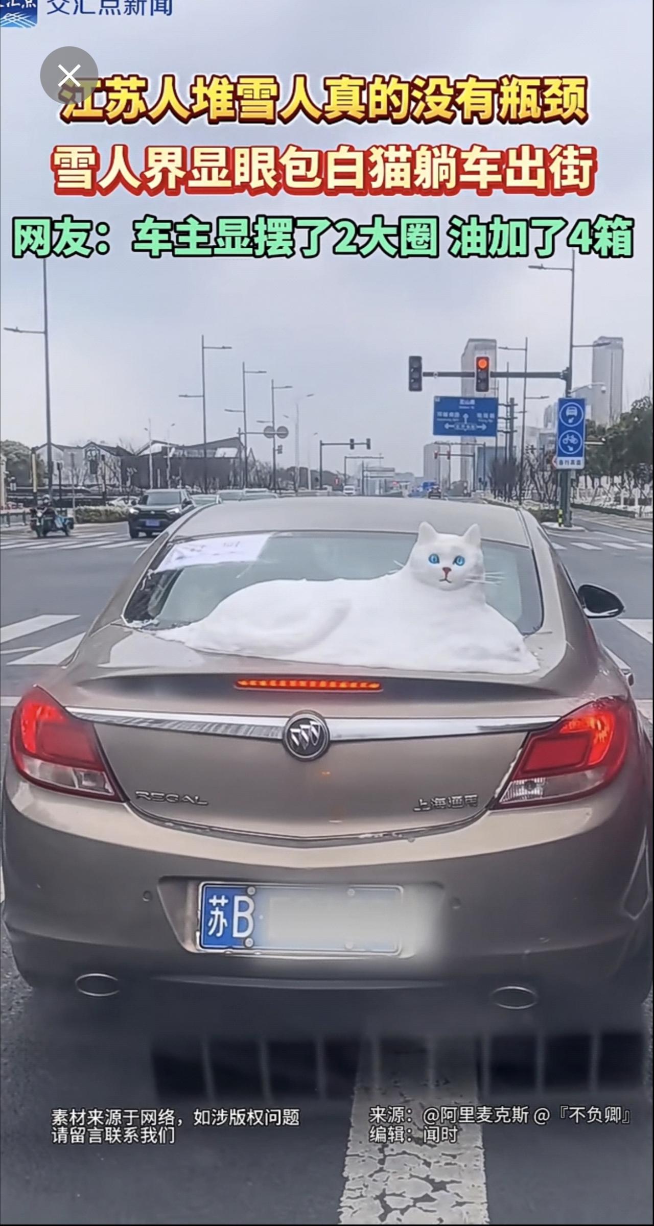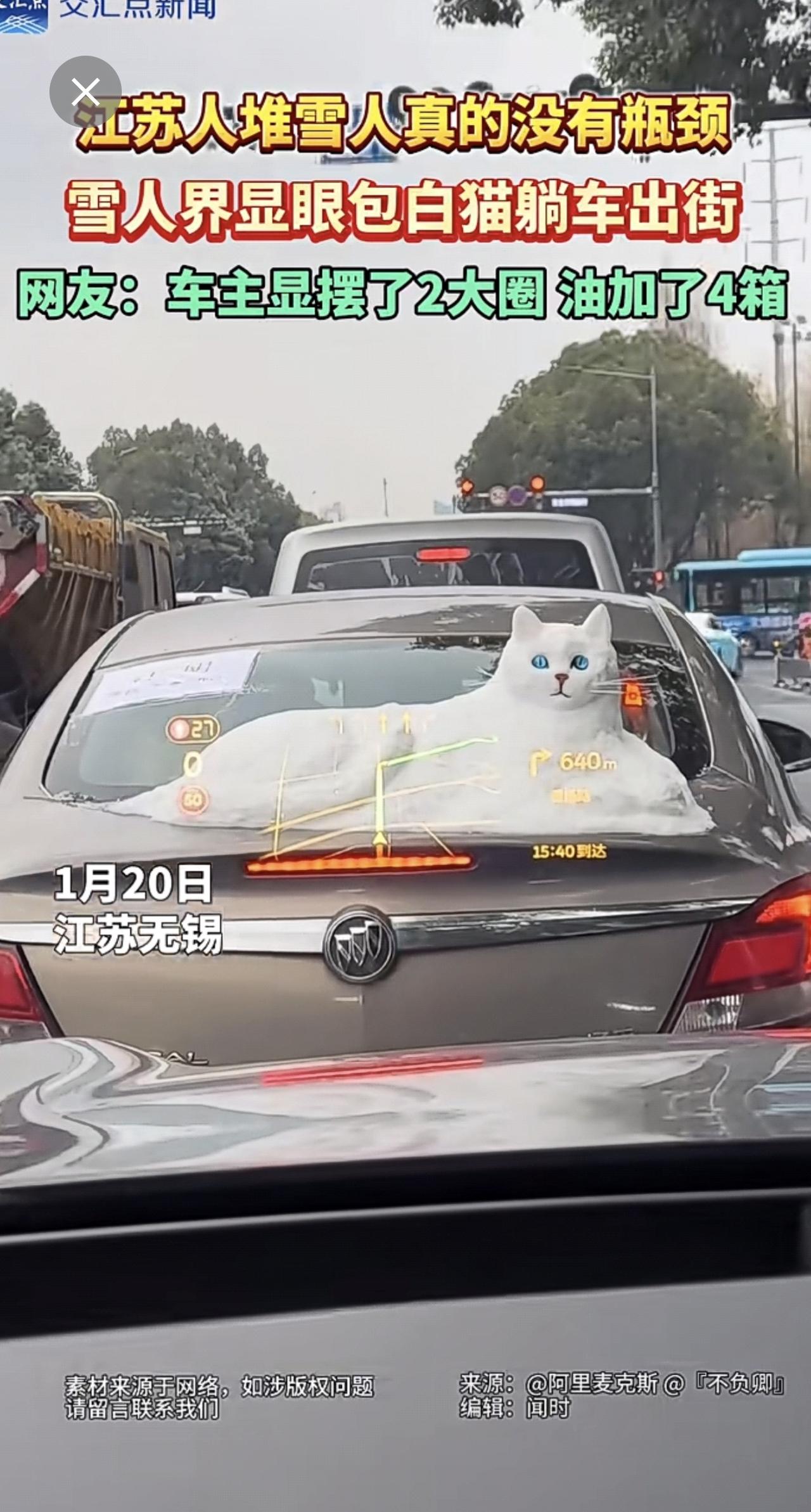 江苏人堆雪人真的没有瓶颈!1月20日,雪后初晴,江苏无锡街头一辆车上“躺着”一只白色的猫咪,惟妙惟肖,它的眼睛像宝石一样蓝,胡须根根分明。网友:车主显摆了2大圈,油加了4箱。堆雪人