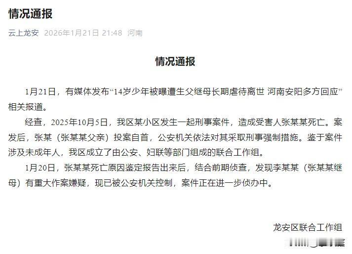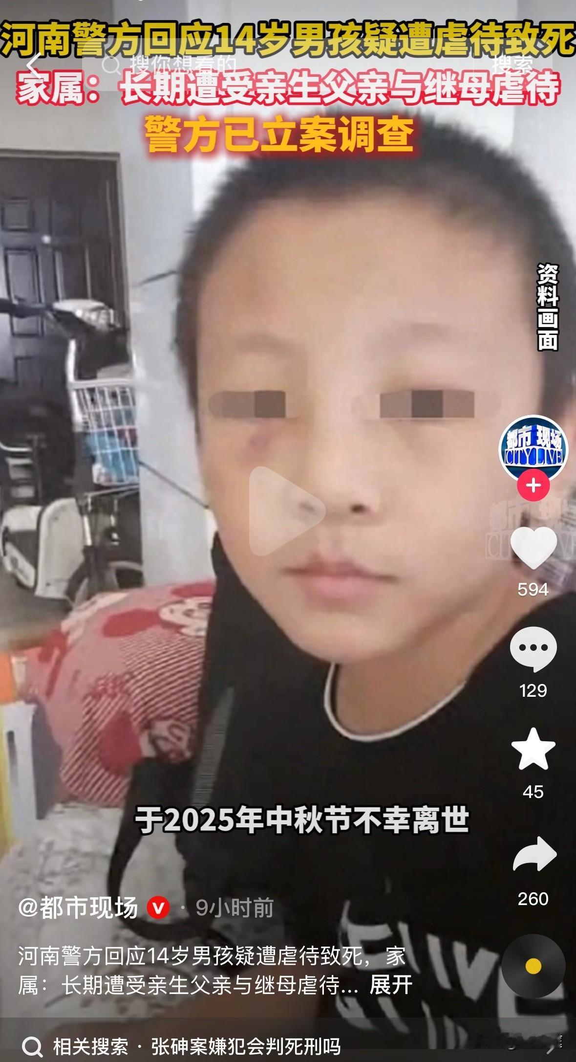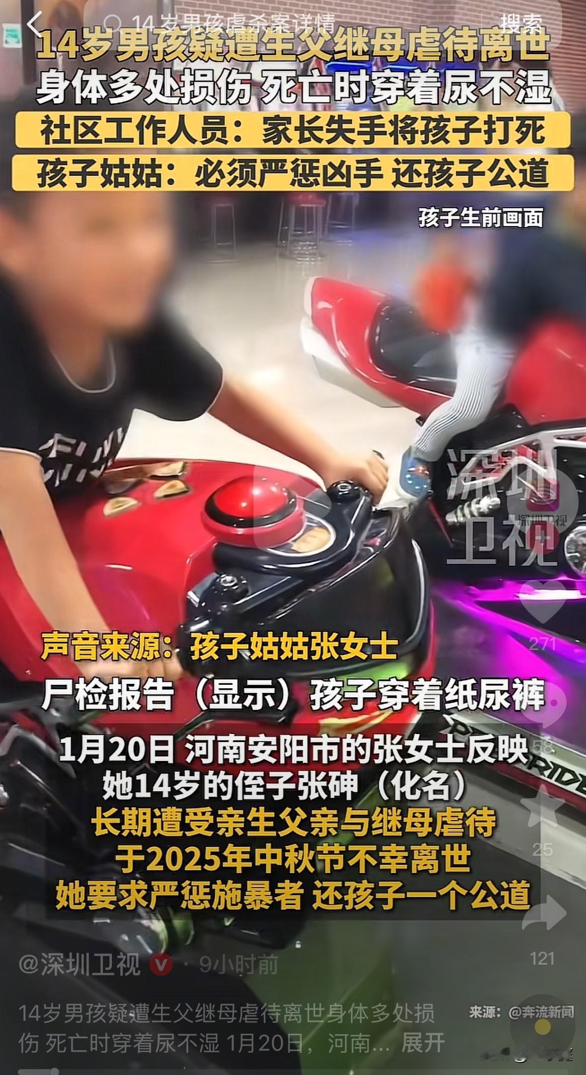 疑因被继母生父长期虐待致死的14岁少年在半岁时,生母就离开了家,从此再也没有来看过他! 这个可怜的孩子名叫张砷(化名),他2012年出生,河南安阳人。 他的父亲是一名货运司机,大多数时间要在外地奔忙。在他还没断奶的年纪,亲生母亲就选择了离婚,自此,再也没有出现过! 姑姑和奶奶共同把他带到9岁,上学后,他寄宿在姑姑家里。那时候的他还一切如常,虽没有生母的庇佑,但姑姑对他不错,起码有人关心和疼爱他,可以让他每天吃饱穿暖。 然而,所有的一切在5年前被改变。 他的父亲和一名离异女子组成家庭后,于2021年下半年,将他接回了自己家中。 本以为,是结束了寄人篱下的生活。 没想到,回到自己家中仅仅5年时间,张砷的生命便不在了! 2025年10月5日,年仅14岁的他永远停止了呼吸。 姑姑在殡仪馆里见到了他最后的样子: 他穿着尿不湿,整个人瘦的皮包骨,几乎是前胸贴后背!14岁的他身高只有区区1.4米,身上有大大小小的的伤痕、淤青。 按道理来说,14岁的男孩子已进入到发育阶段,是身高快速增长的阶段。然而,他的身高和体重都远远没有达到同龄人的标准范围。 悲剧发生后,其生父投案自首称是自己一时失手将孩子打死了,他把所有的罪责揽在了自己身上。 2026年1月21日,当地联合工作者做出了情况通报。 根据内容可知,孩子继母也涉案其中,现如今她已经被警方控制!具体的情况就要等案件侦办之后才能知道了。 可怜的张砷,都已经14岁了啊!再过几年都可以自己走上社会独立了,可他却再也没有机会长大了! 作为一个母亲,有一句我不得不说: 每个孩子都是带着爱来到世间的,为人父母,一定要担起应有的责任才是!无论婚姻关系如何,都要好好对待自己的孩子才是。不要愧对孩子叫我们的那一声声“爸爸”、“妈妈”! (信息源:深圳卫视、都市现场)