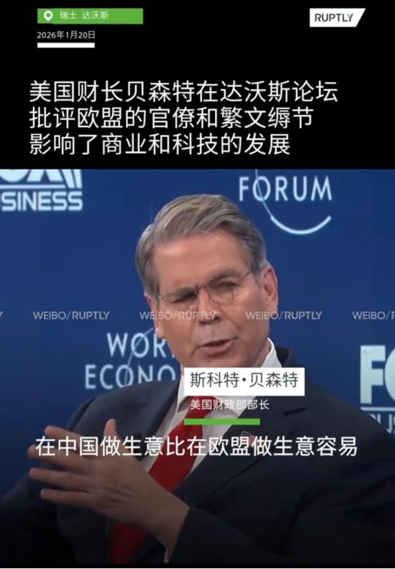 中国成达沃斯的香饽饽:美财长盛赞中国经商环境,马克龙抛出橄榄枝,比利时首相哀叹“中国截然不同” 这可不是西方突然良心发现,真心想和中国搞好关系,说到底都是自身难处逼出来的,背后全是算计。 美国财长贝森特他在达沃斯公开说,有美国科技公司高管告诉他,在中国做生意比在欧洲容易得多。这话听着是夸中国,其实藏着两层意思。 一方面,欧洲确实不争气,内部官僚主义严重,办点事繁文缛节一大堆,效率低得惊人,对比之下中国政府办事专业高效,企业不用耗在流程上。 另一方面,美国现在也有自己的麻烦,特朗普政府动不动就对盟友挥关税大棒,国内企业日子不好过,急需中国这个大市场撑着。 要知道,2025年中国对美国进出口占比已经降到了8.8%,美国对中国市场的依赖度可不低,尤其是科技企业,离不开中国的完整产业链和庞大消费群体。 贝森特夸中国营商环境,本质上是想让中国对美国企业更开放,好让美国企业多在中国赚钱,弥补国内市场的损失。之前美国还动辄拿营商环境说事儿,现在主动改口,完全是利益优先,怎么对自己有利就怎么说。 美国的态度转变,还和全球经济格局有关。世界经济论坛报告显示,全球经济前景虽略有改善,但不确定性仍大,欧洲经济前景最疲弱,53%的首席经济学家预计欧洲增长乏力,而中国经济被普遍看好,24%的人认为中国会实现强劲增长,47%预计温和增长。 美国清楚,现在想孤立中国根本不现实,反而会让自己错失机遇,不如换个姿态,想从中国市场分一杯羹。 不光美国财长变了口风,法国总统马克龙更是直接向中国抛橄榄枝,公开说欧洲非常欢迎中国加大直接投资。他这话可不是空穴来风,背后是法国被美国逼得走投无路了。 就在马克龙去达沃斯前不到48小时,美国宣布对法国出口的葡萄酒、香槟等加征200%关税,这对以葡萄酒产业为重要支柱的法国来说,无疑是沉重打击。 马克龙在演讲里痛斥美国的帝国主义野心,却不敢和美国硬拼,只能转头找中国帮忙。他希望中国企业去欧洲建厂、买技术、搞研发,既能解决欧洲的就业问题,又能带动经济增长,对冲美国关税战带来的损失。 但他的算盘打得太精,欧洲一边在政治上跟着美国搞“去风险”,对中国电动汽车、光伏产品设限,一边又想让中国敞开腰包投资,这根本就是双重标准。 面对马克龙的示好,中国的态度很清醒。外交部发言人明确表示,中国鼓励企业赴欧投资,但前提是欧方必须提供公平、非歧视、透明、可预期的市场环境。 说白了,我们可以去投资,但不能一边赚中国的钱,一边又卡中国企业的脖子。马克龙想靠中国“回血”,却不想放下傲慢,这种示好根本没多少诚意。 比利时首相哀叹“中国截然不同”,这话倒是说出了欧洲的无奈。中国这些年一直稳步优化营商环境,就拿北京来说,为了方便境外人士,实现了机场商户外卡受理全覆盖,地铁支持五大卡组织“拍卡过闸”,还推出了集支付、通信、交通于一体的卡片,让外籍人士在华出行经商更便利。这些实打实的举措,对比欧洲的低效和政策摇摆,反差确实明显。 更关键的是,中国经济的稳定性在全球变局中格外突出。2025年中国对欧盟进出口增长6%,占进出口总值的13%,欧盟对华贸易总额占其进出口总值的14.5%,双方在高技术产品、新能源设备等领域的合作越来越紧密。 中国不仅是“世界工厂”,更是“世界市场”,能给欧洲企业提供稳定的发展空间,这是欧洲现在最需要的。 其实西方各国在达沃斯对中国的态度转变,核心原因就是全球经济形势变了。 美国搞“美国优先”,动不动就对盟友加关税,把欧洲逼得不得不另寻出路;欧洲自身产业空心化、政策摇摆,经济增长乏力,急需中国的资本和市场;而中国经济稳定增长,营商环境持续优化,产业链完整,已经成为全球经济的重要稳定器。 我们得看清,西方现在讨好中国,不是认可中国的发展道路,而是基于自身利益的务实选择。就像美国之前想封锁中国半导体,最后反而被迫放松限制;现在西方各国在达沃斯对中国示好,也是因为离不开中国的市场和稳定环境。一旦他们度过难关,说不定又会回到打压中国的老路上。 中国始终保持清醒,既不拒绝合作,也不盲目乐观。我们欢迎各国企业来华投资兴业,也愿意去海外拓展合作,但前提是平等互利、相互尊重。 达沃斯上的热闹景象,本质上是中国实力提升的体现,也是西方各国应对自身困境的无奈之举。未来的合作,还得看西方能不能放下双重标准,拿出真正的诚意,不然再好的示好也只是镜花水月。