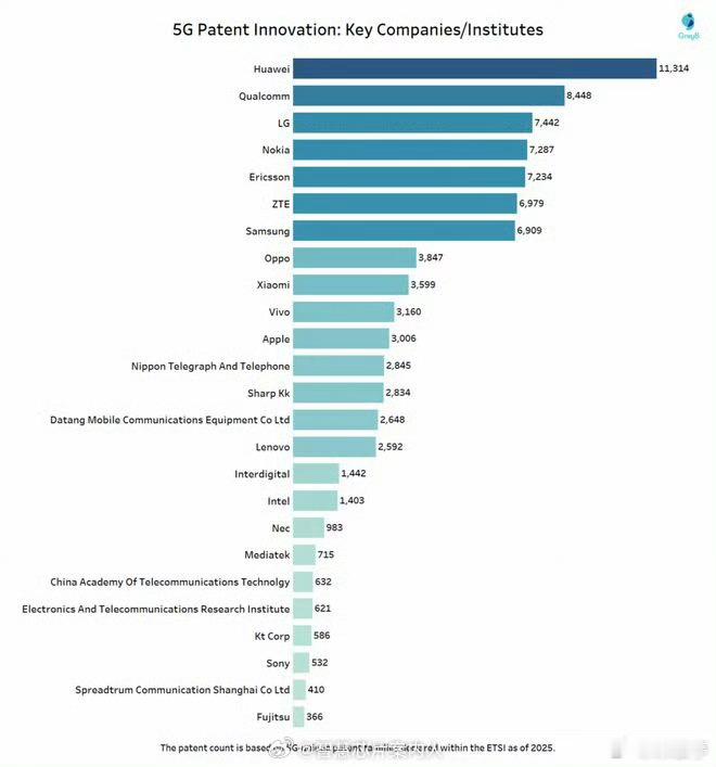 ETSI 2026年1月最新行业分析报告显示,全球5G标准必要专利持有厂商TOP10榜单出炉,华为以11314项专利的绝对优势稳居榜首,高通、LG、诺基亚、爱立信紧随其后。这份榜单中中国厂商表现亮眼,共有华为、中兴、OPPO、小米、vivo五家企业入围,占据半壁江山,其中中兴位列第六,OPPO、小米、vivo则包揽第八至第十位。三星以6909项专利排在第七,而苹果则位居第十一位,未进入前十阵营。