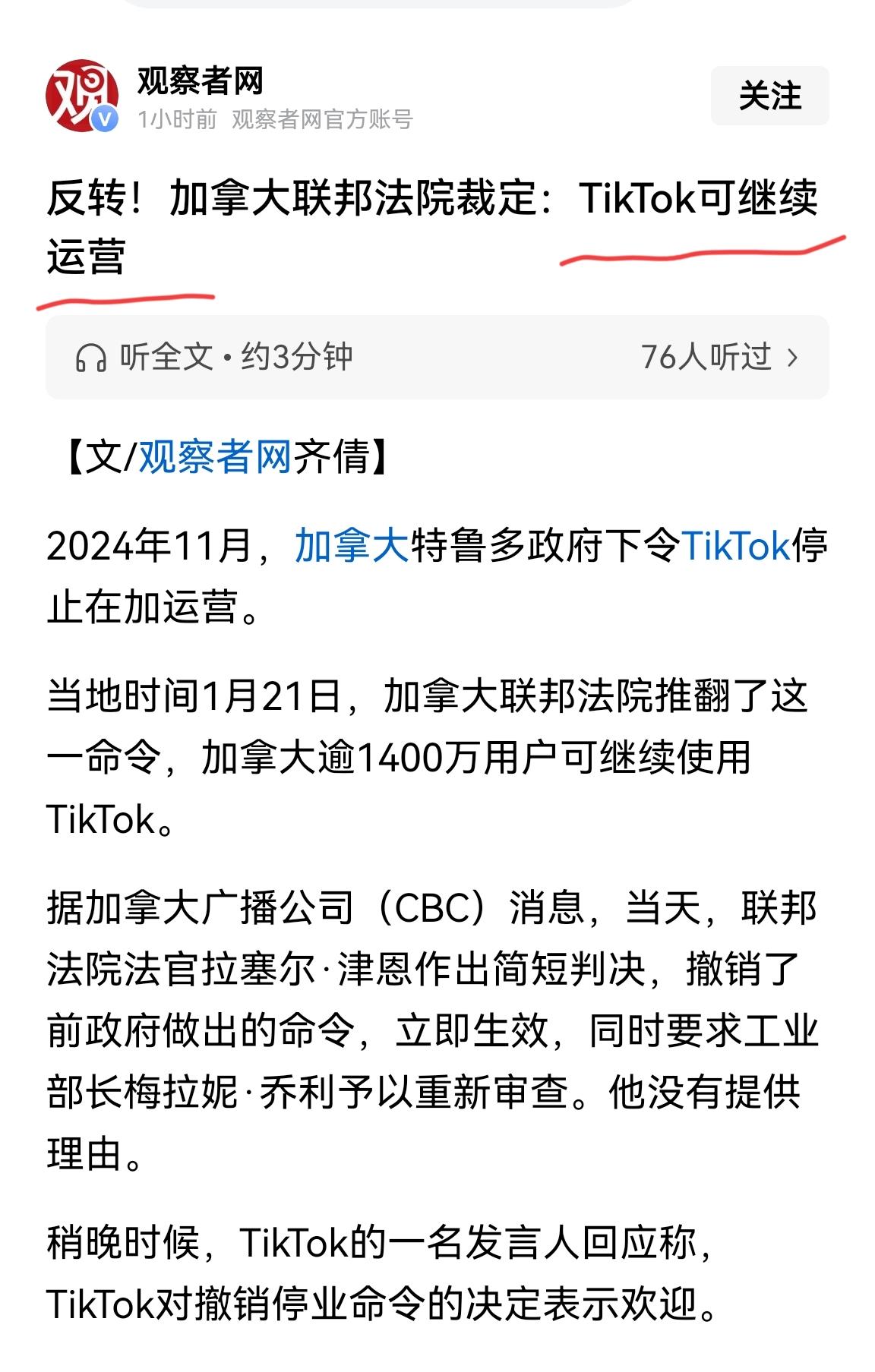 加拿大这次是玩真的了,刚刚直接推翻了上届政府在2024年停止Tiktok运营的命令。 当地时间26年1月21日联邦法院做出判决Tiktok在加拿大立即可以继续运营。 Tiktok在加拿大拥有1400万用户,这一决定将向世界发出强烈信号,重要的是将产生众多连锁反应。 还是我们国内网友总结的那句话:全世界终有一天会发现,有一个强大且热爱和平的中国存在,对大家都有好处。 因为一旦真正进入弱肉强食的丛林法则,很多国家都会发现:原来自己也是一盘菜。