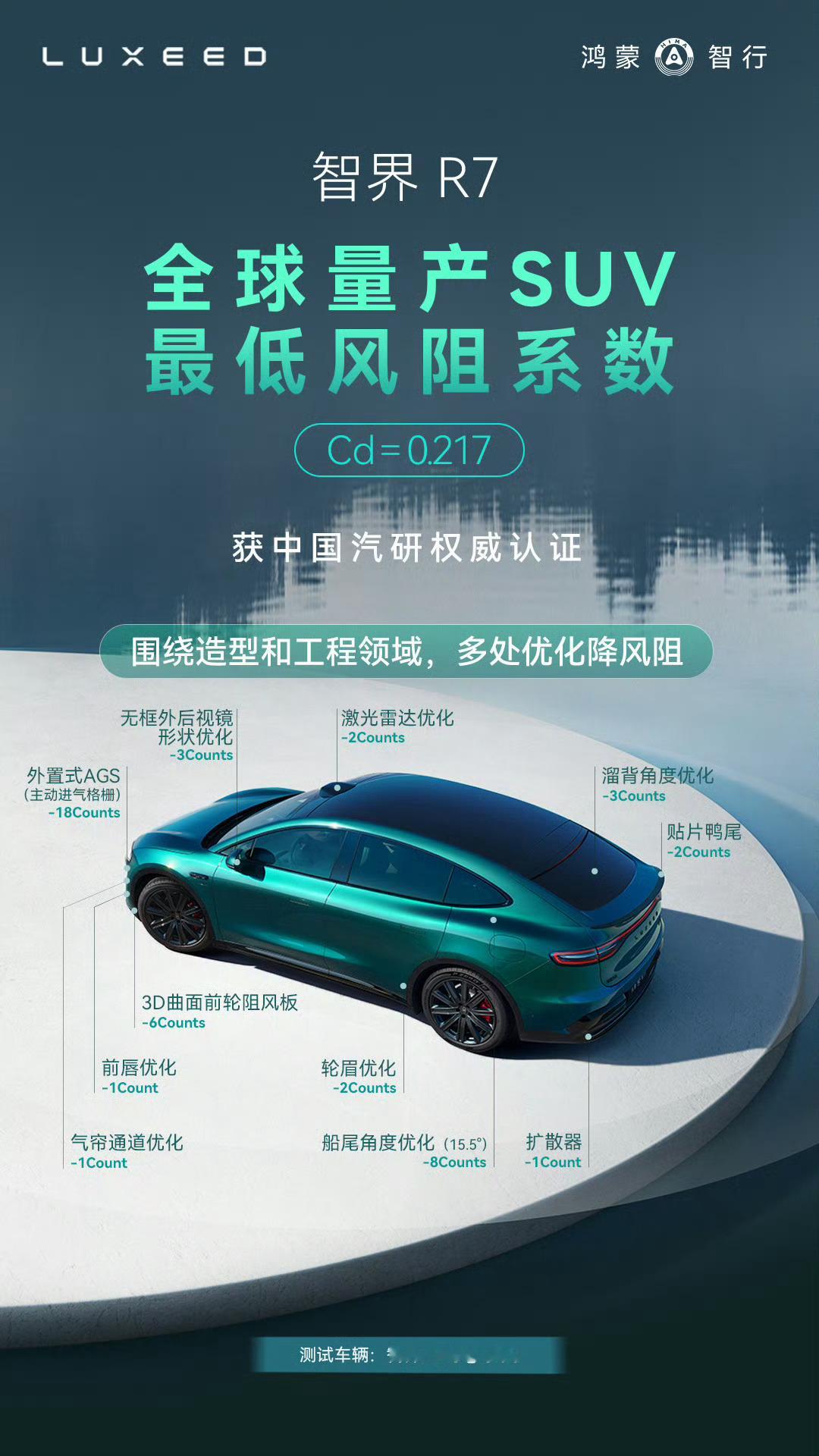 智界R7创全球量产SUV最低风阻纪录 你的续航有多少为风阻买了单智界R7创全球量产SUV最低风阻系数0.217!风阻系数还是挺影响汽车的整体续航的,你们买车会考虑风阻吗?