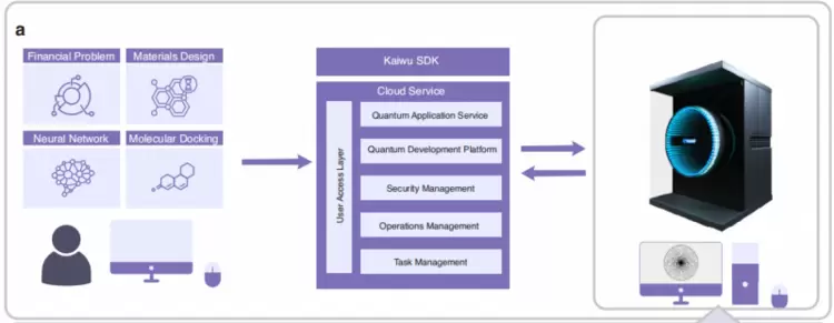 a图:相干光量子计算服务作业流程示意图。完整流程包括用户向云服务器提交计算任务(如分子对接、金融分析、神经网络和材料设计),云服务器将这些任务转换为伊辛模型矩阵,并通过KaiwuSDK传输至相干光量子计算机。FPGA连接本地计算机,利用获取的伊辛模型矩阵进行计算。