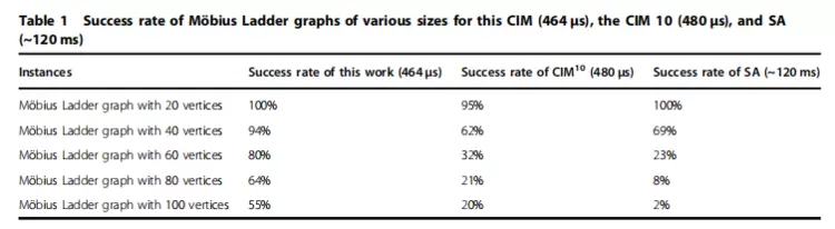 表1:基于CIM(464μs)、CIM10(480μs)及SA(~120ms)计算不同顶点大小的莫比乌斯梯形图的成功率