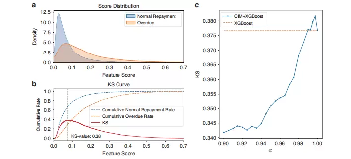 c图:随着α参数的增加,量子特征选择CIM+XGBoost模型的KS统计量持续上升。当α值超过0.99时,该量子特征选择模型的性能已超越未进行特征选择的XGBoost模型。