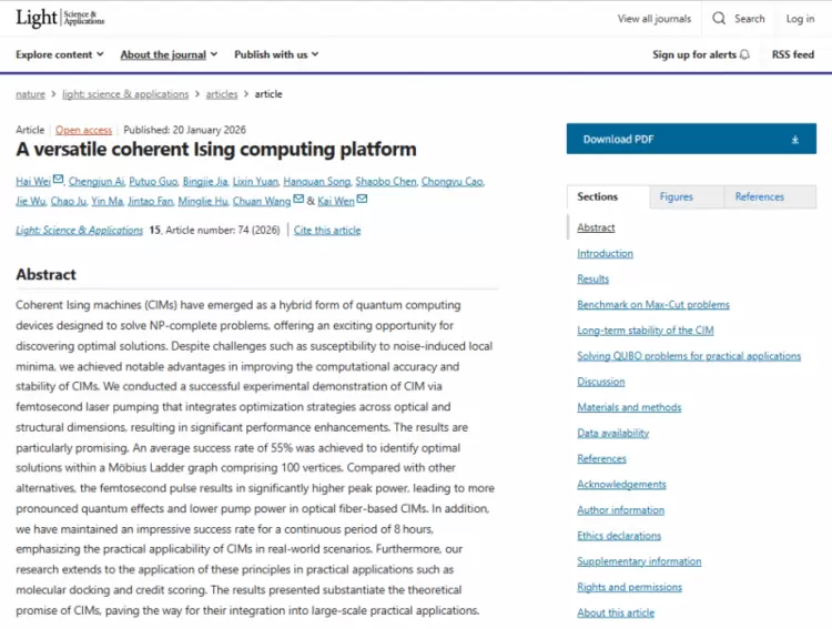 2026年1月20日,北京玻色量子科技有限公司(以下简称“玻色量子”)联合北京师范大学、天津大学在光学领域殿堂级期刊《Light:ScienceandApplications》(LSA)上发表了一篇以《AversatilecoherentIsingcomputingplatform》为题的学术论文。玻色量子CTO魏海博士、ChengjunAi、PutuoGuo、BingjieJia、LixinYuan为论文共同第一作者,玻色量子创始人&COO马寅为论文联合作者,玻色量子创始人&CEO文凯博士、魏海博士、北京师范大学王川教授为论文的共同通讯作者。