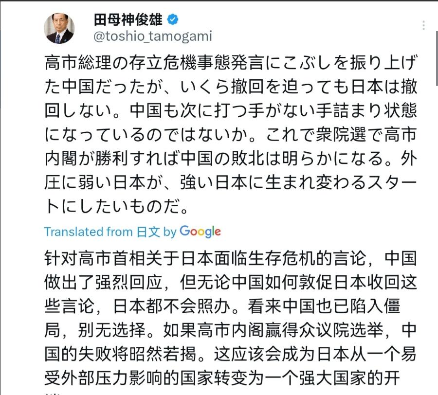中国“无计可施”,日本将更加强大!日本极右翼分子田母神俊雄撂话声称,中国虽然对高市早苗首相的存亡危机事态发言挥动了拳头,但无论如何要求撤回,日本都不撤回。中国是不是也处于无计可施的状态呢?如果高市内阁在众议院选举中获胜,中国的“失败”就很明显了。 希望这是一个让经不起外界压力的日本脱胎换骨成为强大日本的开端。 高市早苗对着中国的严正抗议死咬着不撤回涉台错误言论,看着像是硬气,可明眼人都能看出来,这不过是死鸭子嘴硬,除了嘴上逞能,日本压根拿不出任何能和中国针锋相对的实际动作,这哪是不怕中国的反制,分明是没本事接招。 要是日本真的有应对中国反制的办法,何至于在中方出手后一招都不敢出? 自高市早苗发表所谓 “存亡危机事态” 的涉台错误言论后,中方迅速拿出了反制措施,商务部在 2026 年 1 月正式加强两用物项对日出口管制,禁止所有相关物项向日本军事用户、军事用途出口,直接掐住了日本想要推动 “再军事化” 的关键命脉。 面对这样的反制,日本除了口头叫嚷,没有任何实质性的反制手段,就连高市早苗本人,也再不敢像最初那样在台湾问题上大放厥词,这哪是中国无计可施,分明是日本被打在了七寸上,只能硬撑着装样子。 要知道台湾问题是中国的核心利益,是碰不得的红线,中方的态度一向明明白白,高市早苗敢越界,中方就敢反制,现在的局面不过是日本自己骑虎难下,只能用嘴硬来掩饰心虚。 更可笑的是,田母神俊雄还把高市早苗内阁可能在众议院选举中获胜,当成是中国的失败、日本强大的开端,这话说出来怕是连日本人自己都不信。 所谓的失败,总得有个衡量的标准吧,是高市早苗胜选后,日本就能凭空改变中日综合国力的悬殊对比,还是能一下子缩小和中国的科技差距?答案显然是都不可能。 就拿最直观的经济数据来说,2024 年中国 GDP 已经是日本的近 5 倍,2025 年日本经济依旧低迷,第三季度实际 GDP 按年率计算下降 1.8%,到 2025 年底更是创下了连续 5 年贸易逆差的纪录,2025 年单年贸易逆差就达 26507 亿日元,连对美出口都同比减少了 4.1%。 而中国经济始终保持稳定增长,2024 年 GDP 增长 5.0%,2025 年前三季度依旧有 5.2% 的增速,这样的经济差距,岂是一个右翼内阁胜选就能抹平的? 再看硬实力和科技层面,中国的发展更是让日本望尘莫及,2024 年中国汽车出口 586 万辆,连续两年坐稳全球第一的位置,彻底超越了日本这个传统汽车出口大国;中国现役航母已有三艘,福建舰更是全球首艘采用常规动力电磁弹射技术的航母,国防力量的发展有目共睹。 在科技领域,截至 2025 年 4 月,中国人工智能专利申请量占全球的 38.58%,位居全球首位,在诸多新兴领域实现了对日本的反超。 而日本呢,一边喊着要强大,一边却连本土的企业都离不开中国市场,根据 2025 年的相关调查,有 58% 的在华日企计划继续维持或增加对华投资,中国市场依旧是日本企业全球战略里的关键一环,这样的现实下,谈何日本超越中国、中国走向失败? 田母神俊雄怕是忘了历史的教训,当年侵华的日本侵略政府在国内也有着极高的支持率,希特勒的纳粹政府也曾被部分民众追捧,可最终的结果都是走向彻底的毁灭,原因无他,就是因为他们走的是违背历史潮流、损害世界和平的错误道路。 如今的日本右翼势力,和当年的极端势力何其相似,高市早苗政府上台后,不断推进修订 “安保三文件”,大幅增加防卫预算,2026 财年的防卫预算更是创下 9.04 万亿日元的历史新高,还频频放出拥核言论,一心推动日本 “再军事化”,挑战战后国际秩序。 这样的做法,不仅遭到了中国的坚决反制,也引起了国际社会的高度警惕,就连日本国内的民众,都纷纷集会抗议政府的军备扩张路线,不得人心的道路,就算有一时的支持率,最终也只会走向覆灭。 说到底,田母神俊雄的这番论调,不过是活在自我编织的幻想里,看不清中日关系的现实,也认不清世界发展的潮流。 中国从来都不是无计可施,只是始终保持着理性和克制,中方的反制手段,都是基于维护国家主权和领土完整,基于制止日本的错误行径,每一步都有理有据、合法合规。 而日本右翼势力如果继续执迷不悟,抱着反华的执念不放,只会让日本陷入更深的困境,经济上失去中国这个重要市场,外交上遭到国际社会的孤立,最终为自己的错误付出更大的代价。 所谓的日本 “脱胎换骨” 成为强国,从来都不是靠嘴硬和反华,而是要正视历史、尊重现实,走和平发展的道路,否则一切不过是黄粱一梦。