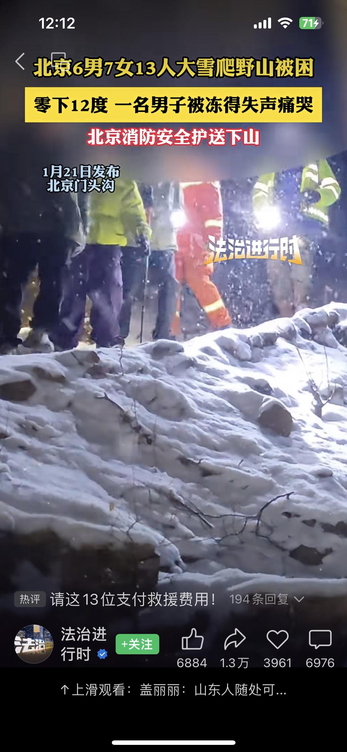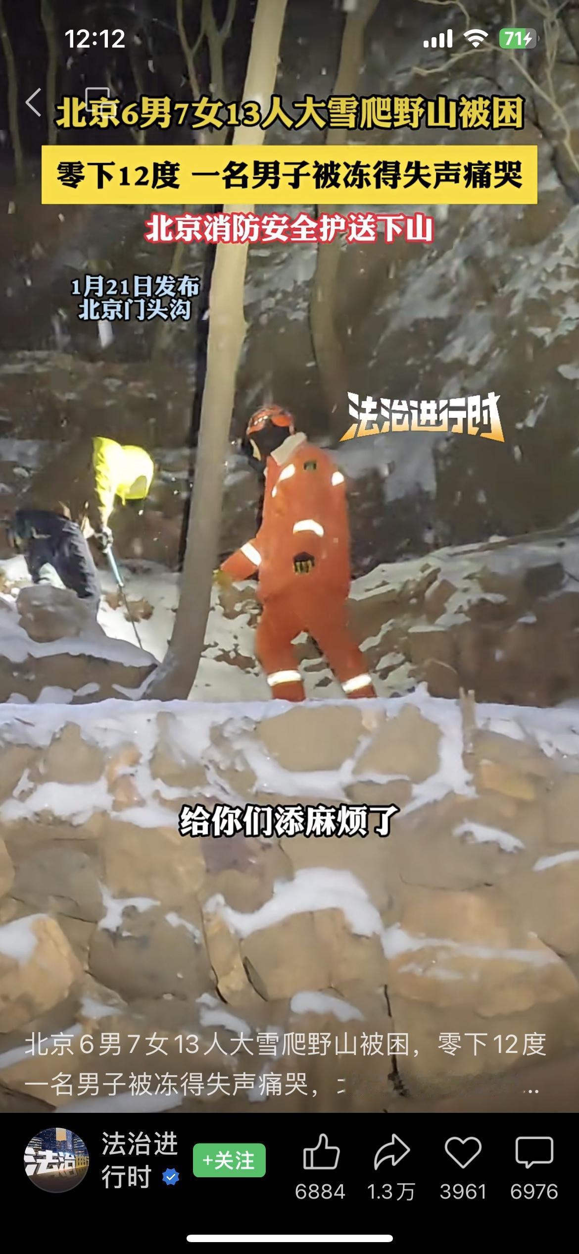 13名男女徒步北京门头沟野山,零下十几度冻的崩溃,报警求援。这是明知山有虎,偏向虎山行。北京这几天山区气温低到十几度,这一群吃饱了撑的男女却选择去爬山,征服自我。在有暖气的室内待久了,完全不知道低温有多可怕。结果走到半路,冻的大哭。等到救援人员找到他们,有个女滴说:给他们添麻烦了。建议,13人平摊救援费。户外探野山 野山路线